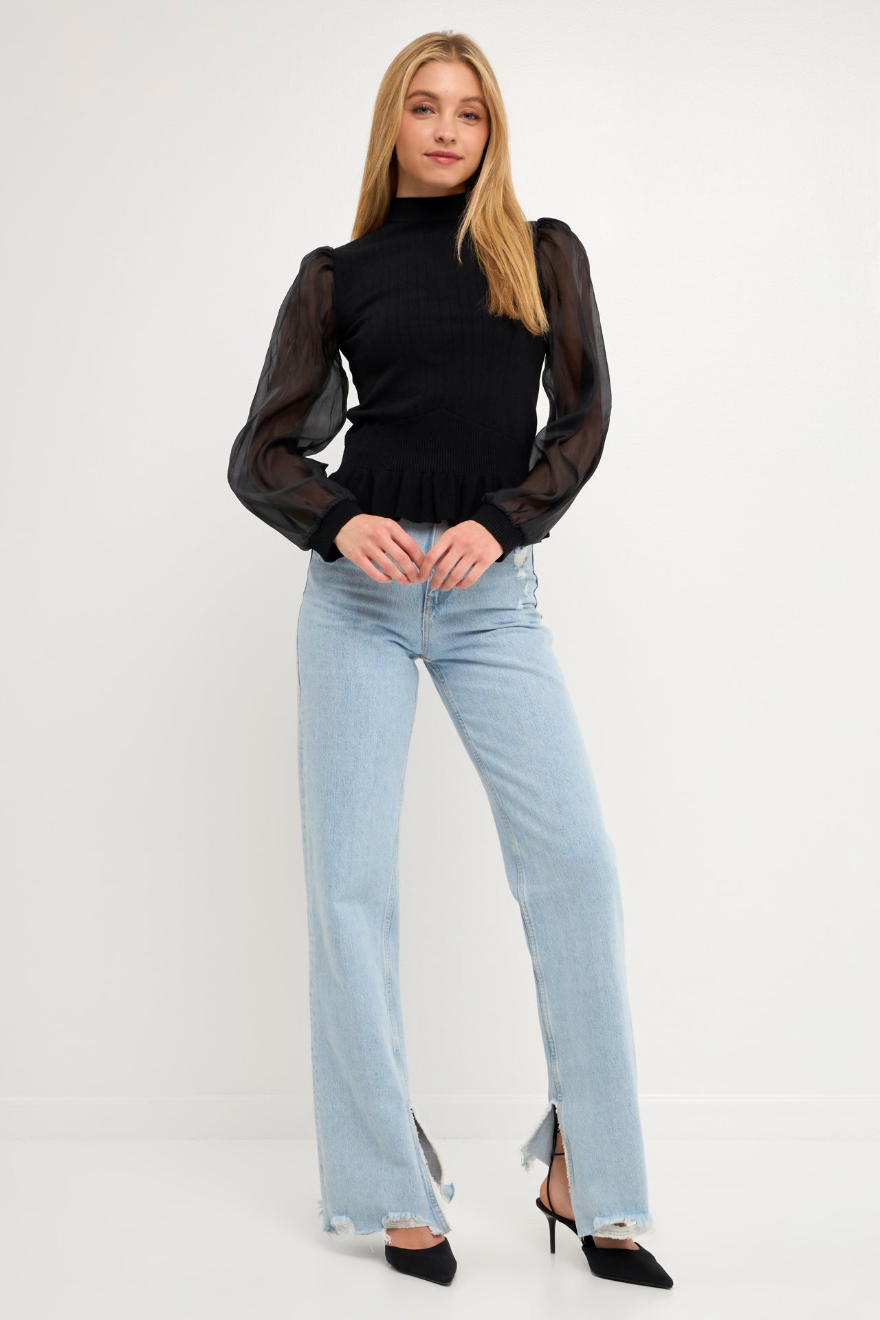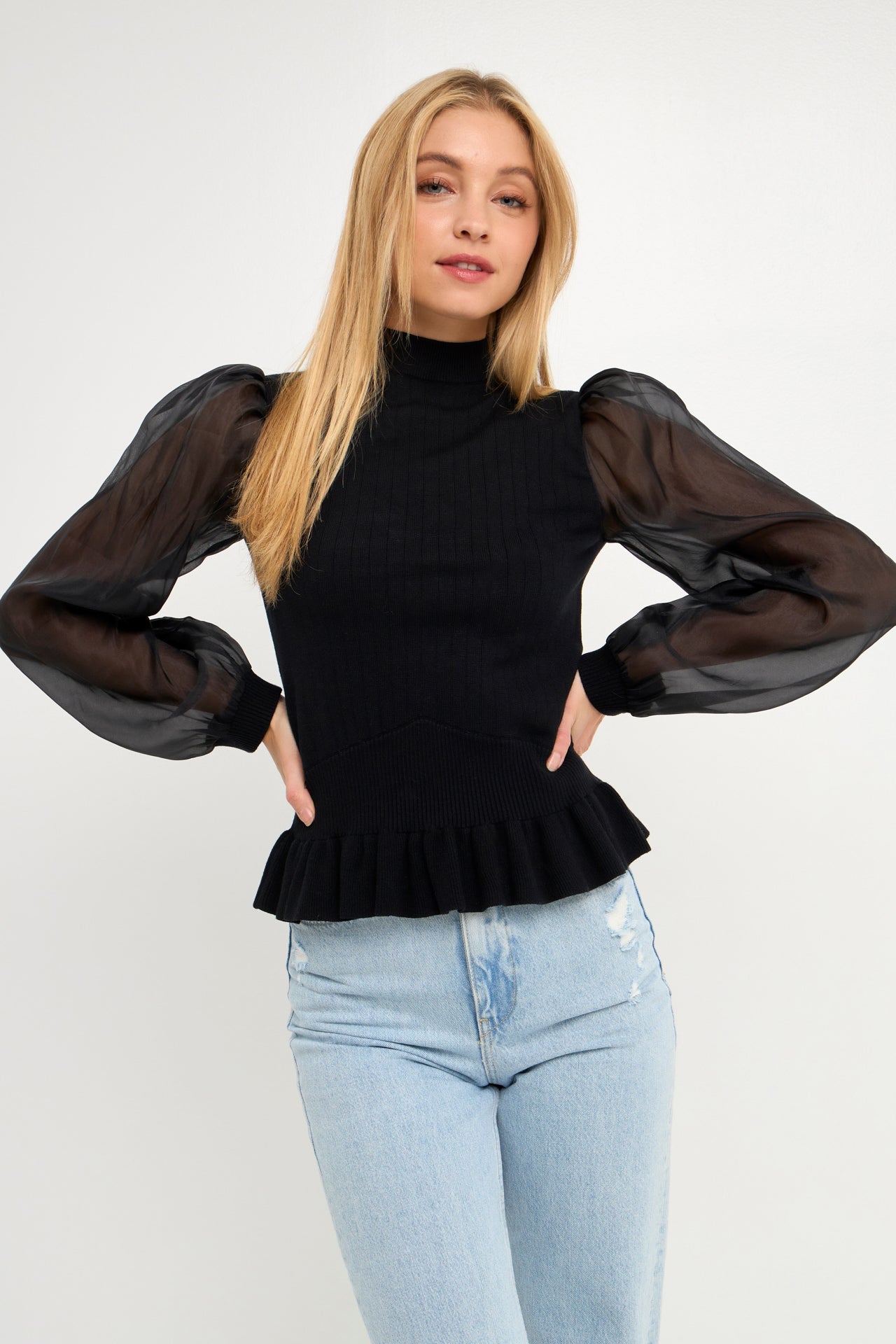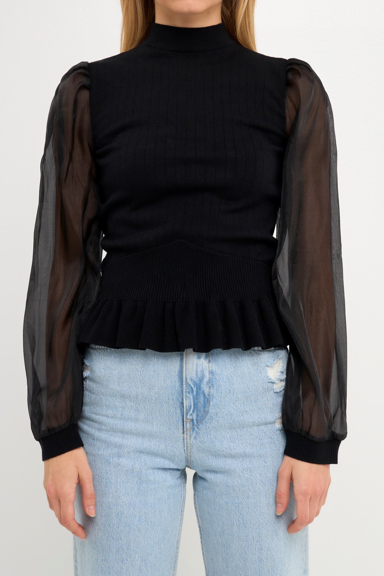 Elevate your style with this knit blouse. With its mixed-media fabrication, this blouse is sure to turn heads. The organza long sleeves and mock neck give it an elevated look, while the knit ribbed waist panel ensures a comfortable fit. Whether you're dressing up for a special occasion or just want to feel a bit more polished, this top is perfect for the job.