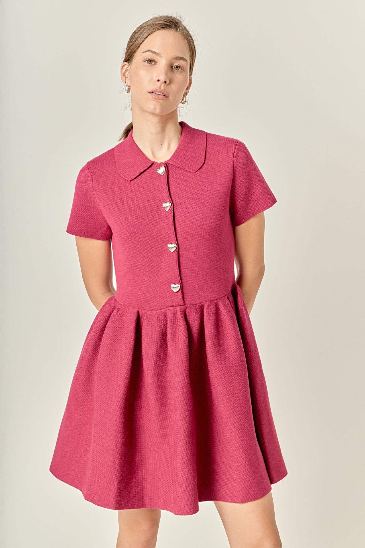 Sweet, sophisticated, and effortlessly stylish, the Heart Button Knit Mini Dress is a standout piece for any occasion. Designed with a flattering fit-and-flare silhouette, it features a collared neckline and shimmering heart-shaped buttons that add a charming touch. The soft knit fabric offers both comfort and structure, making it perfect for dressing up or down. Pair it with heels for a polished look or boots for a playful, preppy vibe.