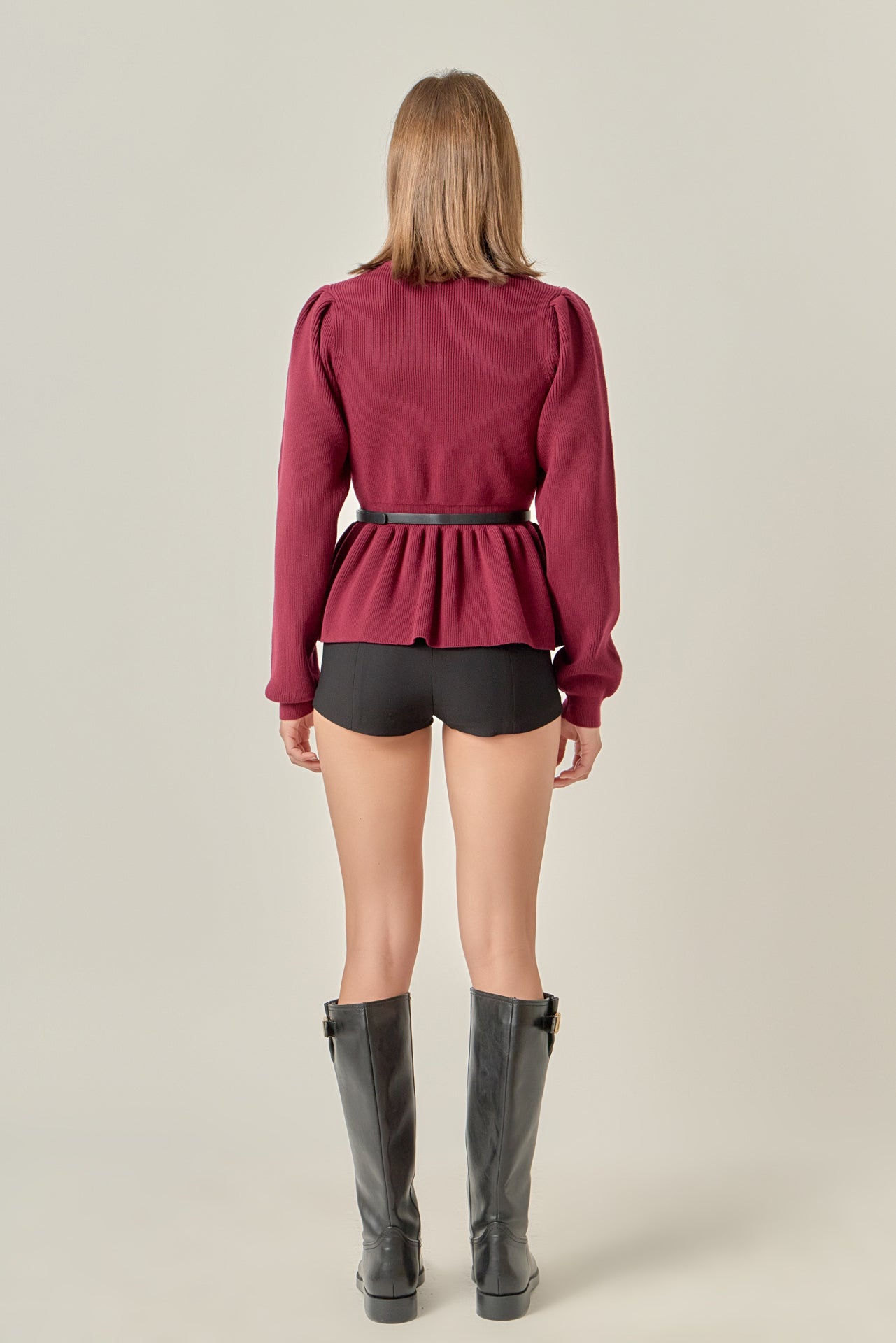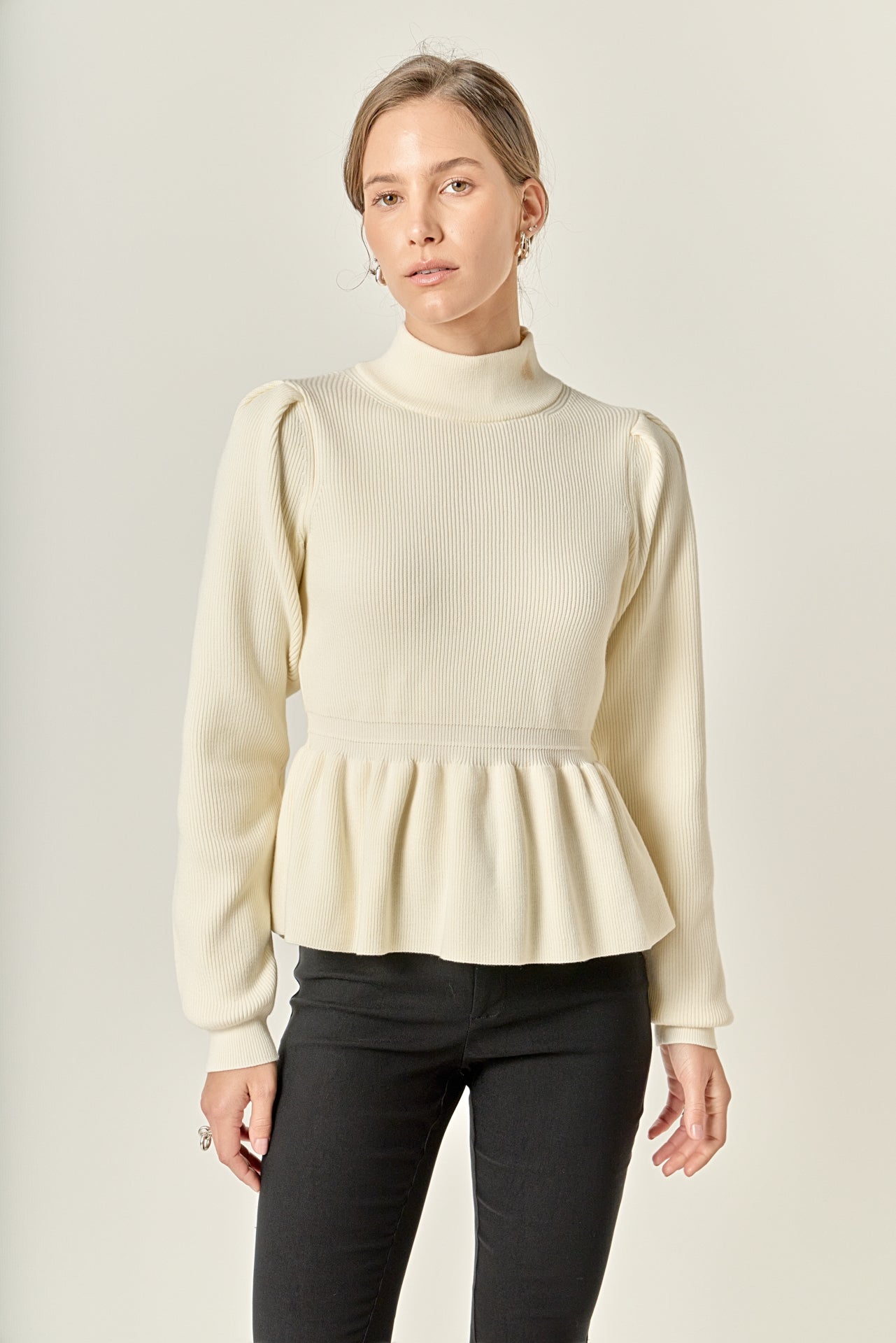Introducing our must-have Peplum Waist Knit Top the perfect combination of sophisticated and trendy. This figure-flattering top boasts a mock neck and puffy long sleeves giving you a chic silhouette. The peplum waist detail adds a touch of flair and elegance making this top a versatile choice for any occasion. Easy to slip on with its pull-over design our knit top is a must-have for any fashion-forward wardrobe. Elevate your style with our Peplum Waist Knit Top available in a variety of colors to suit your taste.