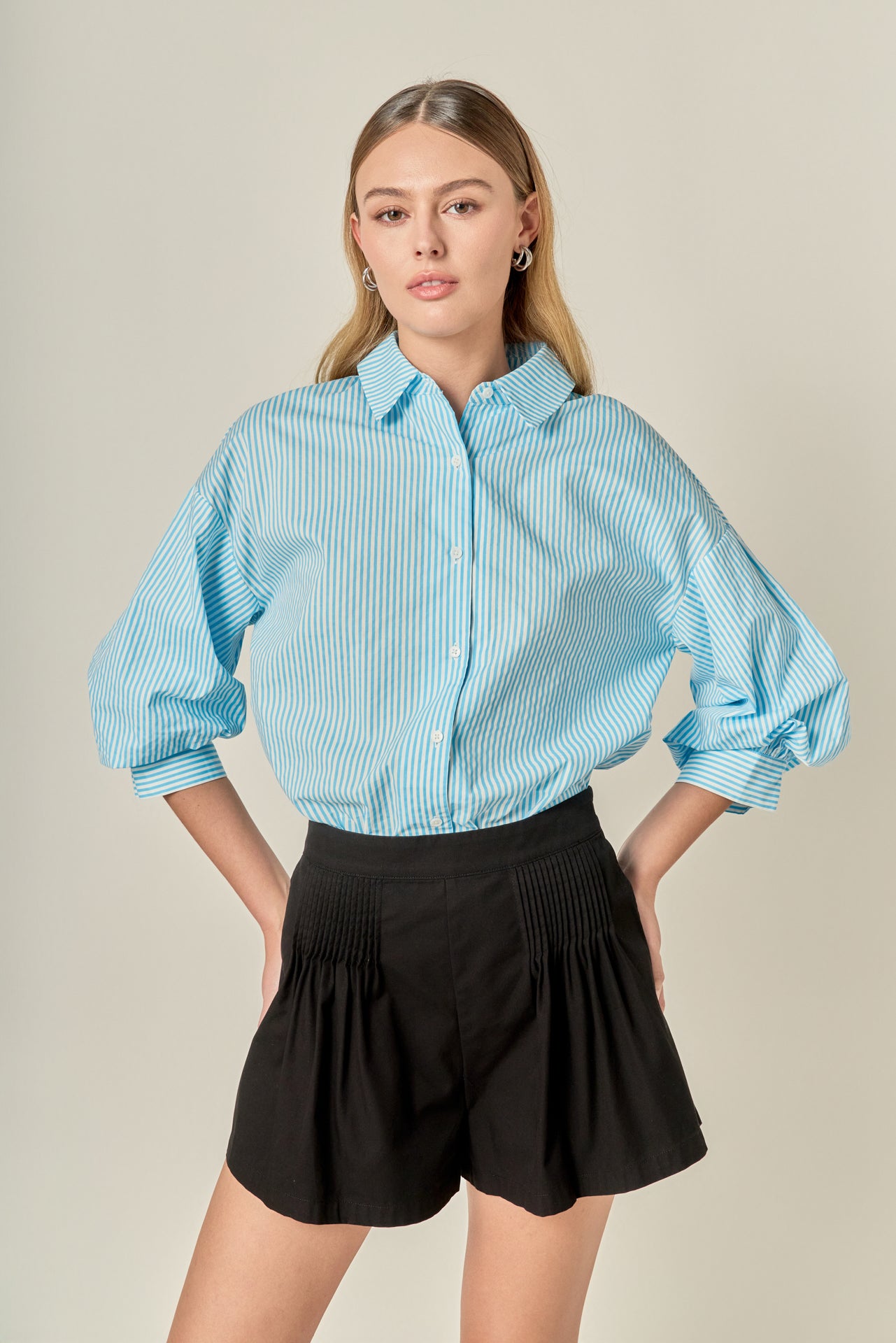 Effortlessly chic with a fashion-forward flare, The Celine Pintuck Shorts are your go-to for elevated summer style. Crafted with crisp pintuck detailing, these shorts feature a flared silhouette that adds movement and shape while keeping things polished. Designed with a high-rise fit, they include side pockets, a hidden side zipper, and an elastic waistband at the back for a comfortable, flattering fit. Whether styled with a crisp blouse or a casual tank, these shorts bring a sophisticated twist to any sunny-day look.