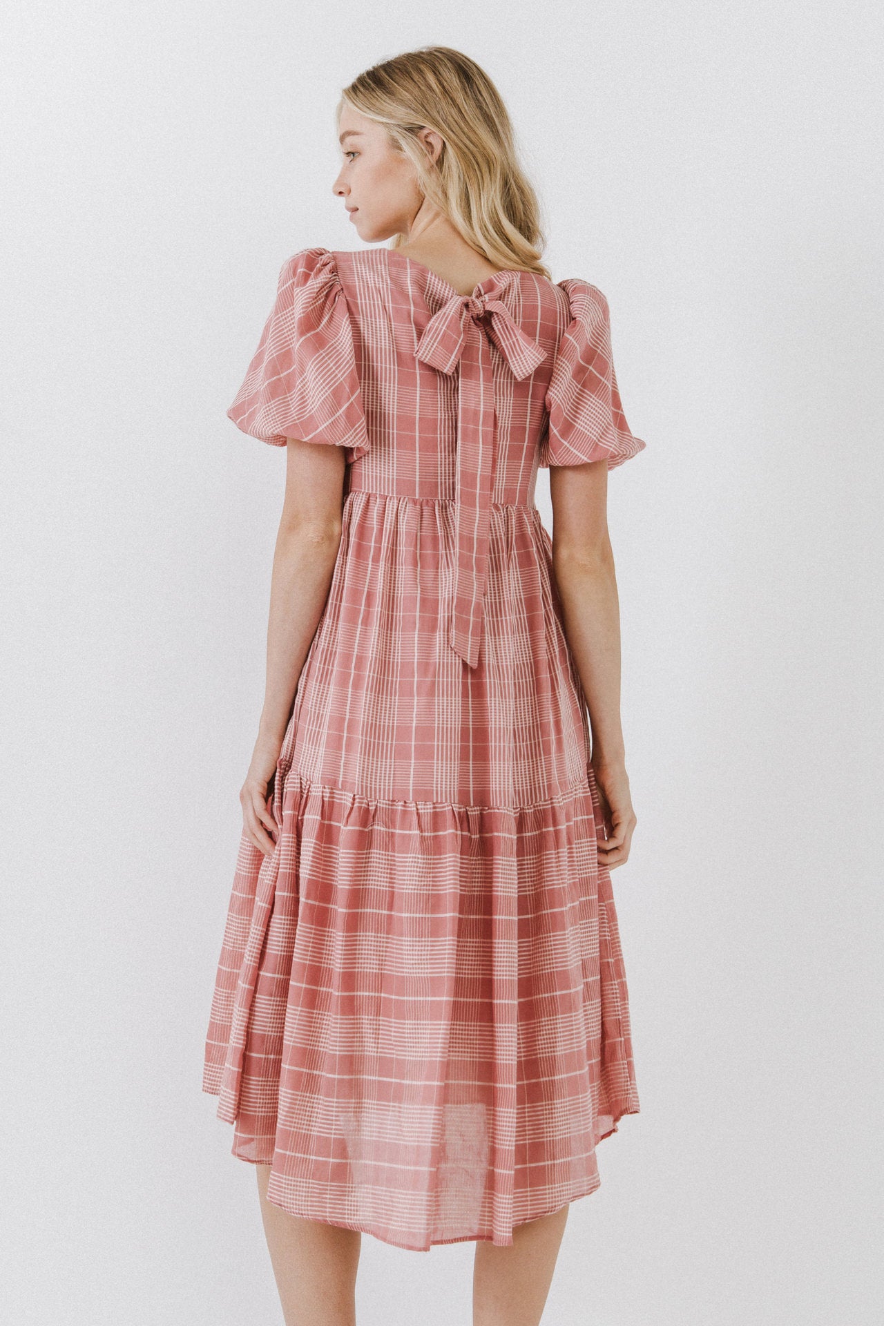 This Plaid Midi Dress is a perfect choice for any event! Featuring a chic check print and statement puff sleeves, it adds a unique touch of style to your wardrobe. The back bow detail adds a note of elegance and the midi length flatters all body types. Made of quality fabric, this dress is both comfortable and stylish. Look fabulous and turn heads Å“ buy this Plaid Midi Dress now!