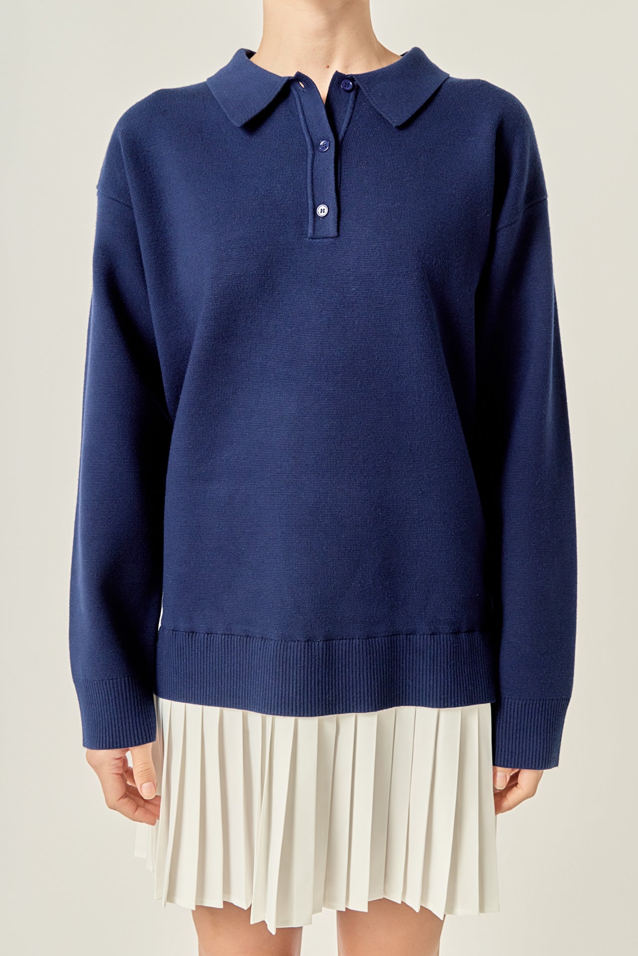 Elevate your everyday look with our Polo Mixed Media Mini Dress. Featuring a soft knit top with a classic polo collar and button placket, this dress brings a polished yet relaxed vibe. The pleated woven skirt adds contrast and movement, creating a chic layered effect. Perfect for transitional weather, its a modern take on preppy style that's both comfortable and effortlessly stylish.