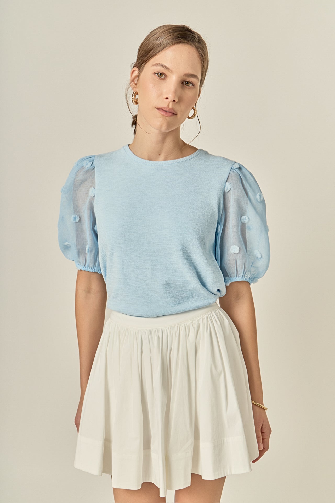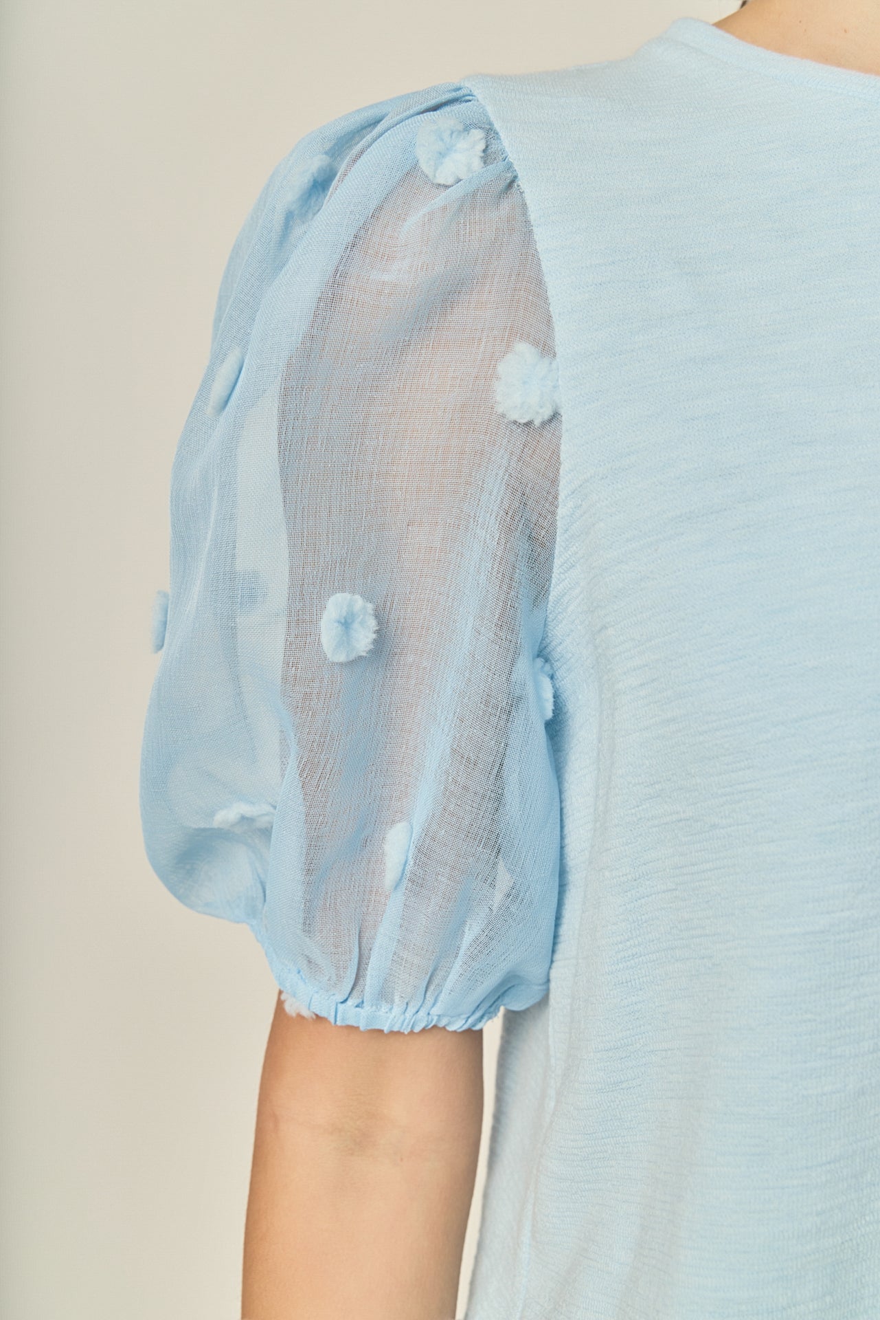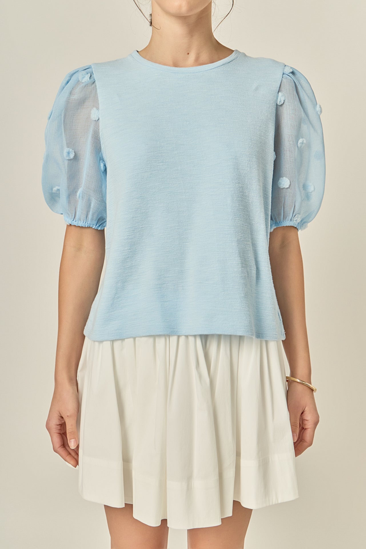 This Pom Pom Mixed Media Top is an ideal choice for everyday style and comfort. It features a flattering round neckline plus short puff sleeves with contrast fabric detail for added interest. It's perfect for pairing with jeans and flats for a casual yet chic look.