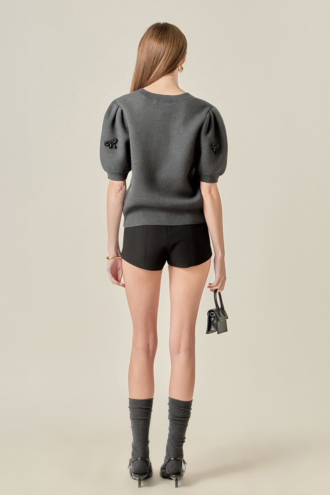 Shine with subtle elegance in our Rhinestone Bow Puff Sleeve Knit Top. Crafted from a soft, cozy knit, this top features delicate puff sleeves and sparkling rhinestone bow embellishments that instantly elevate your look. The ribbed neckline and hems add structure for a flattering fit, while the shimmering details bring just the right touch of glam.