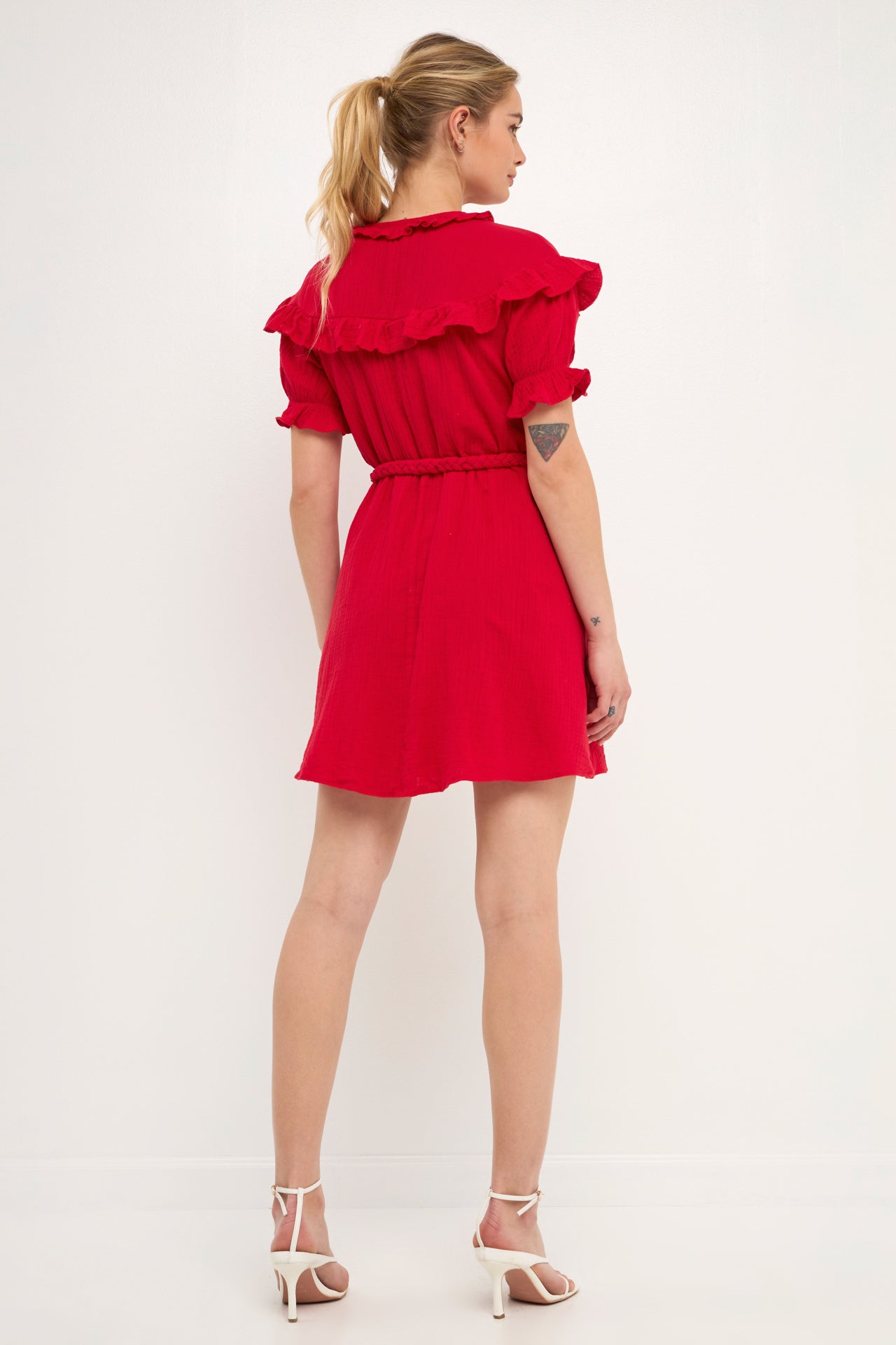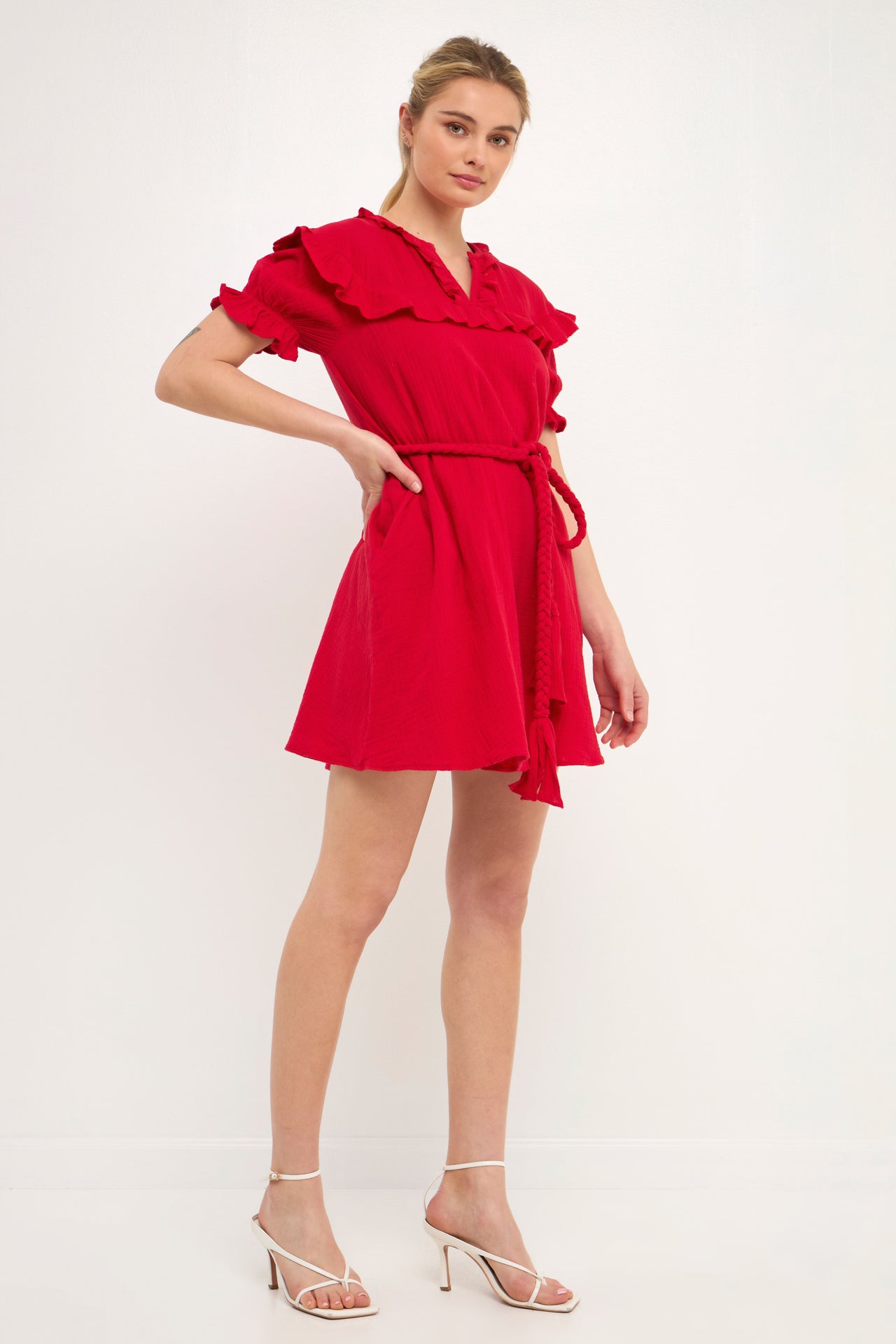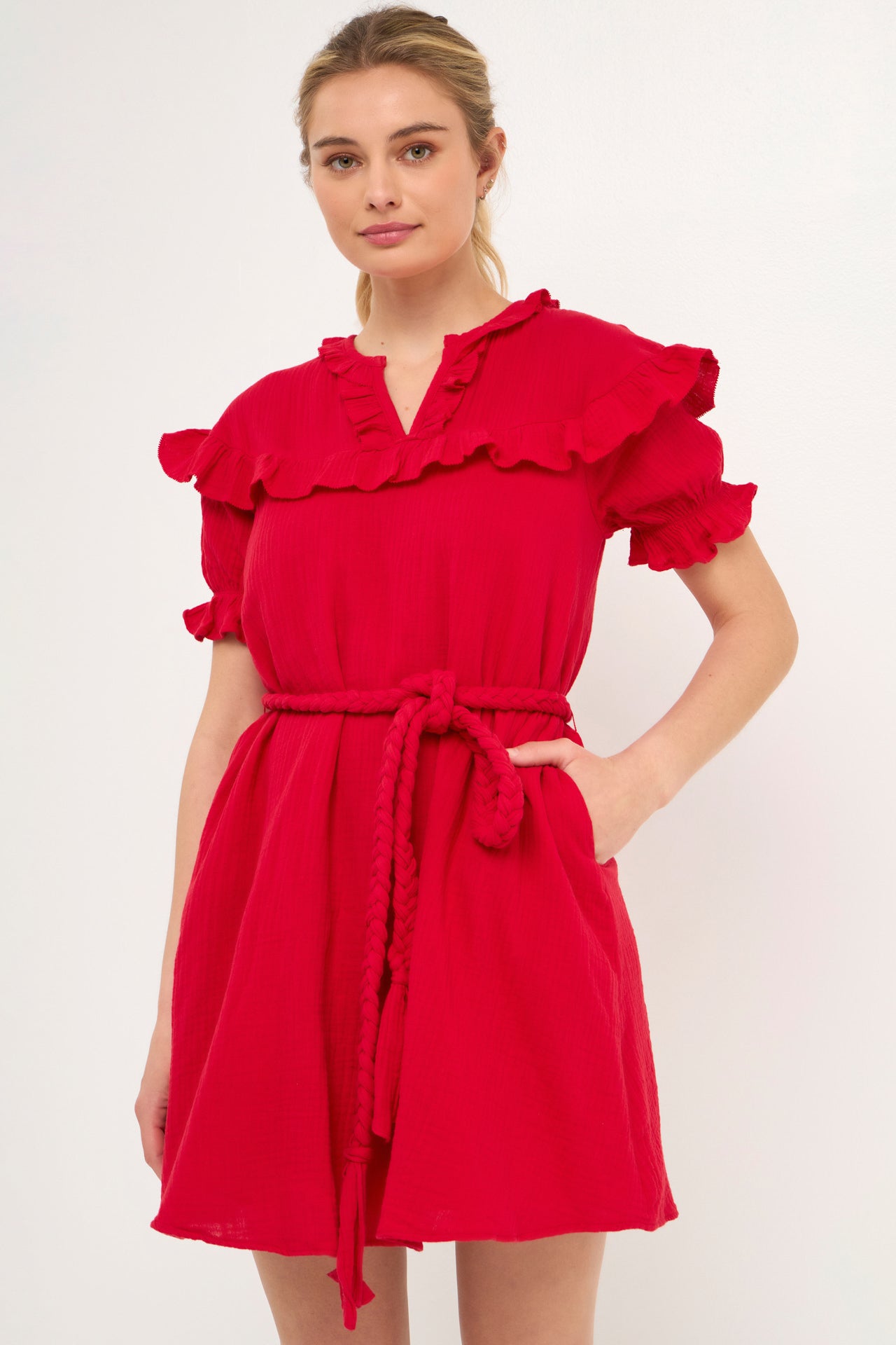 Achieve a unique sense of style with this Ruffled Dress. The puff sleeves and ruffles create a look that is both sweet and stylish. The thick waist strap belt provides definition to your waistline while the pockets at the side add a touch of functionality. The elastic at the sleeve ensures a comfortable and secure fit.