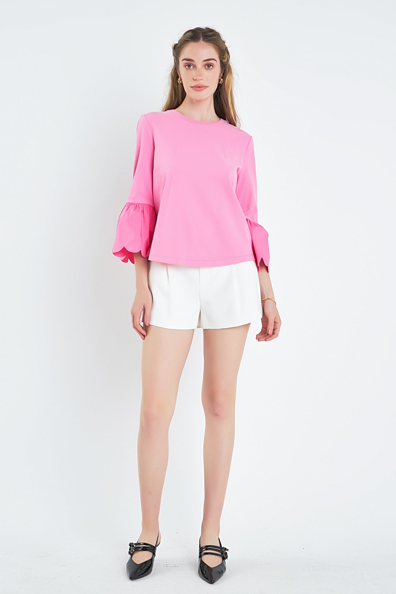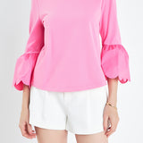 Elevate your everyday t-shirt game with our Scallop Bell Sleeve T-Shirt. Featuring a flattering fitted silhouette this top is perfect for any occasion. The round neckline and 3/4 sleeves add a touch of sophistication while the scallop edge at the sleeves adds a playful and unique detail. Made from high-quality fabric this t-shirt is both comfortable and stylish. Perfect for pairing with your favorite jeans or dressing up with a skirt this Scallop Bell Sleeve T-Shirt is a must-have in your wardrobe. Get yours now and stand out in style.