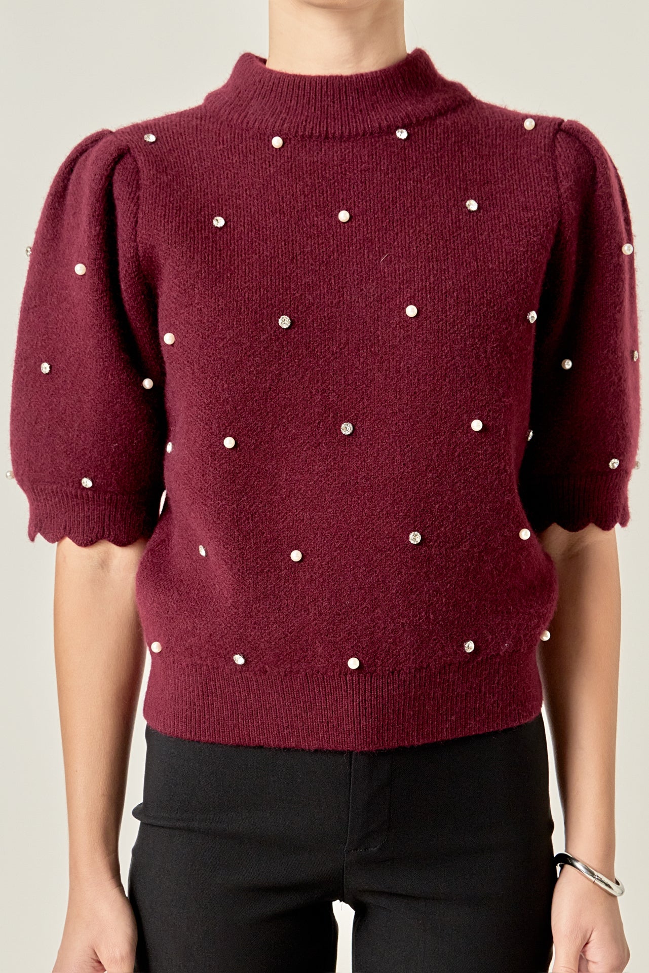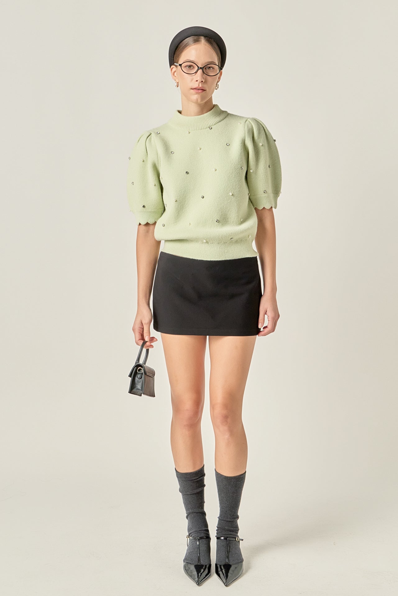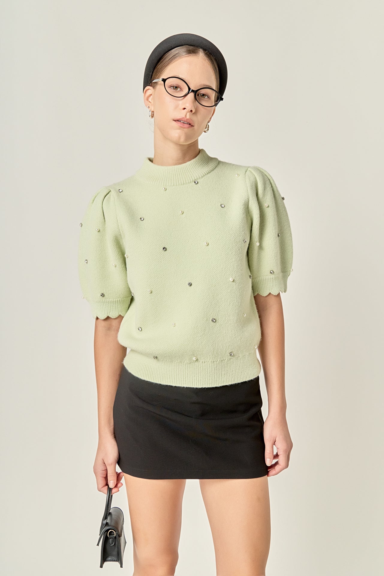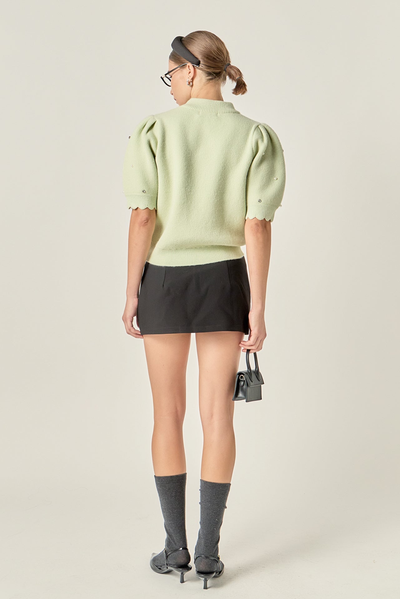 Elevate your wardrobe with our Scalloped Puff Sleeve Embellishment Knit! The mock neck adds a touch of sophistication while the puffed short sleeves give a playful twist. The ribbed texture creates a figure-flattering fit and the edge scallop detail at the neckline and sleeve opening adds a feminine touch. Perfect for both casual wear and dressier occasions this knit is a must-have for your wardrobe.