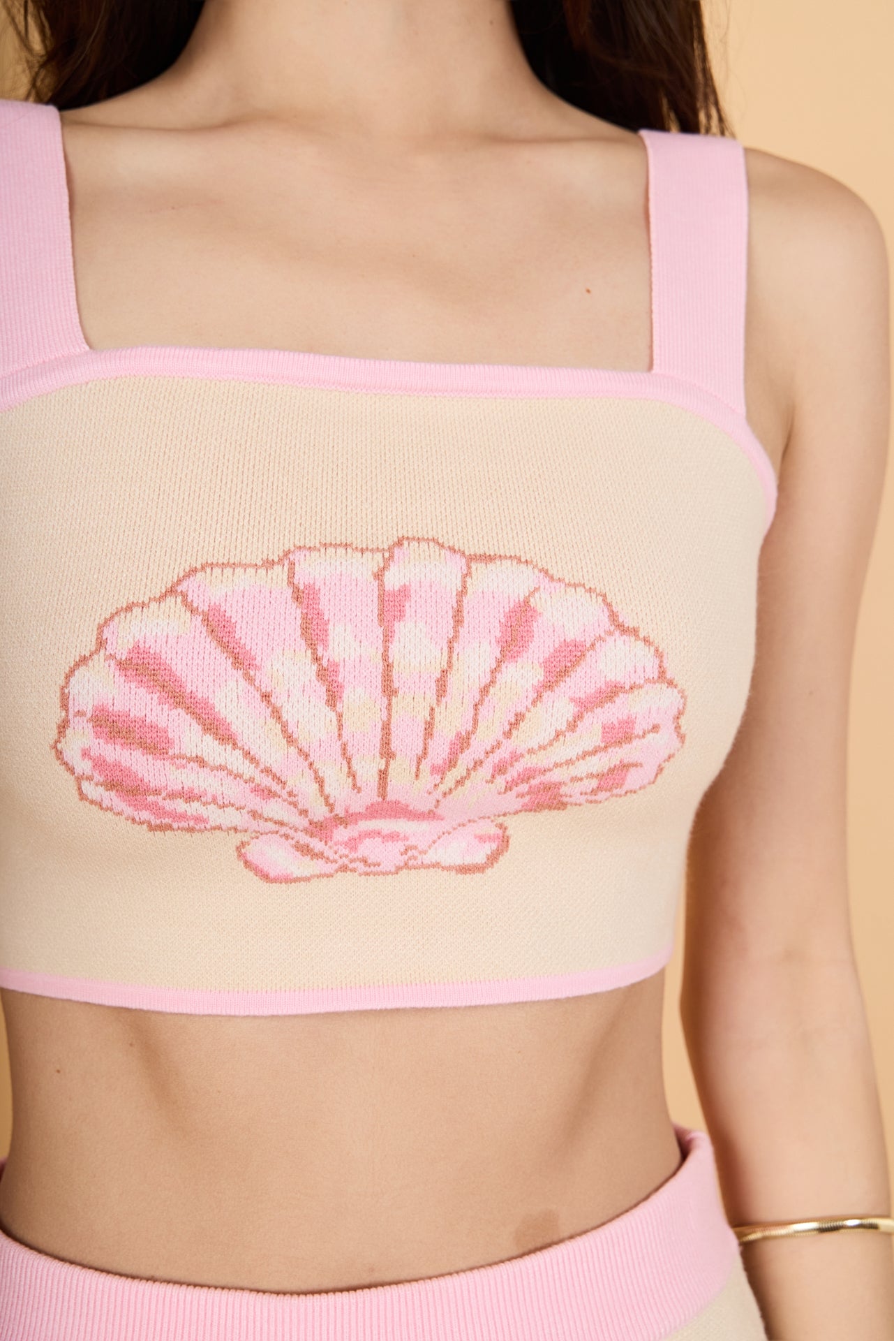 A playful nod to coastal charm, the Seashell Knit Crop Top blends vintage-inspired details with a modern silhouette. Designed in a soft stretch knit, this cropped tank features a statement seashell intarsia motif at the center, framed by contrast pink trim and a flattering square neckline. The fitted shape hugs comfortably while the ribbed construction offers flexibility and structure. Pair it with the matching mini skirt for a coordinated set moment, or style it with denim for an effortless summer look.