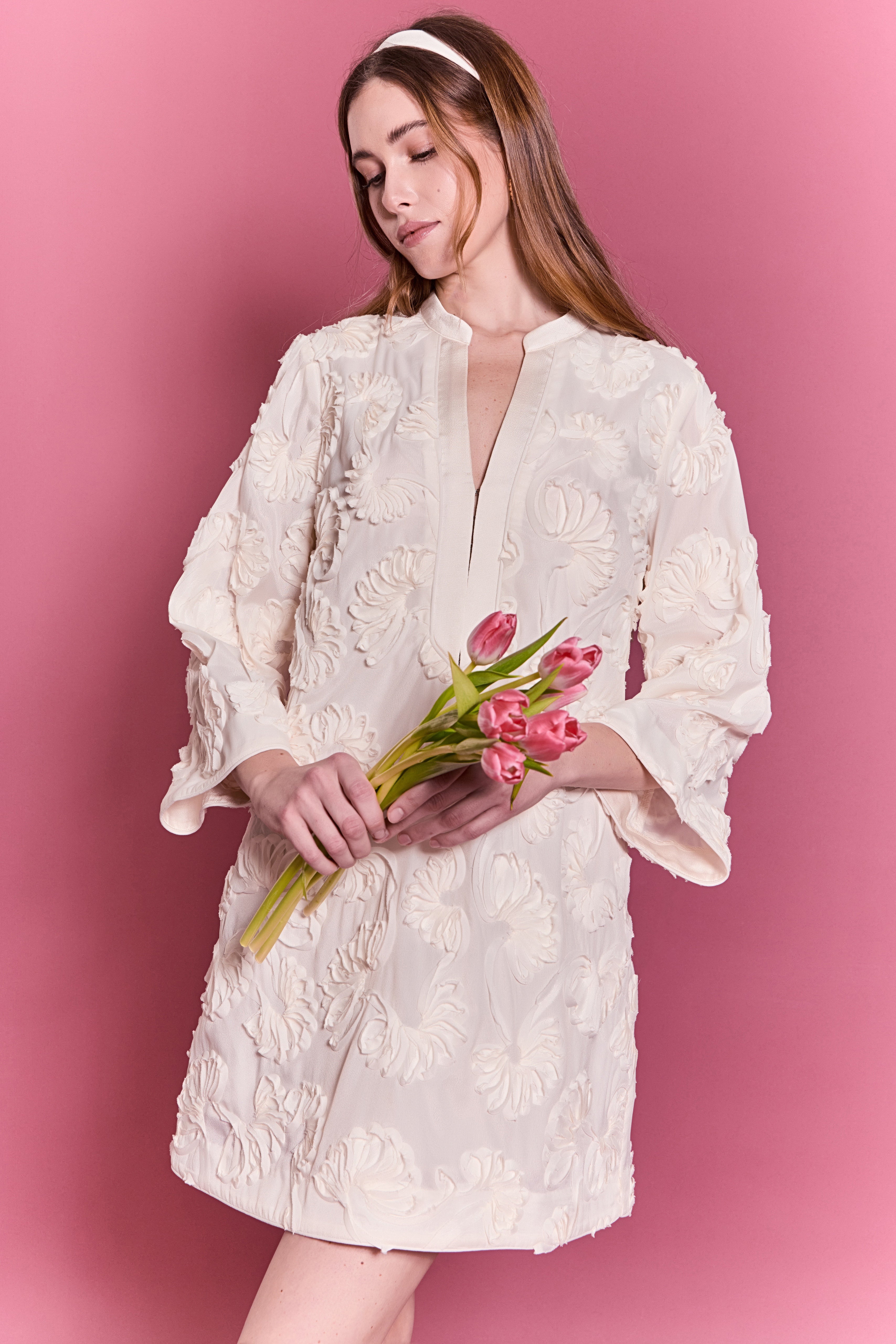 Soft, romantic, and effortlessly polished, this Sculpted Floral Mini Dress features allover tonal floral applique for a textured, dimensional finish. Designed with a clean band collar and a relaxed silhouette, it offers an easy, modern shape that moves comfortably from day to evening. The lightweight fabric and elbow-length sleeves make it a versatile piece for warm-weather dressing.