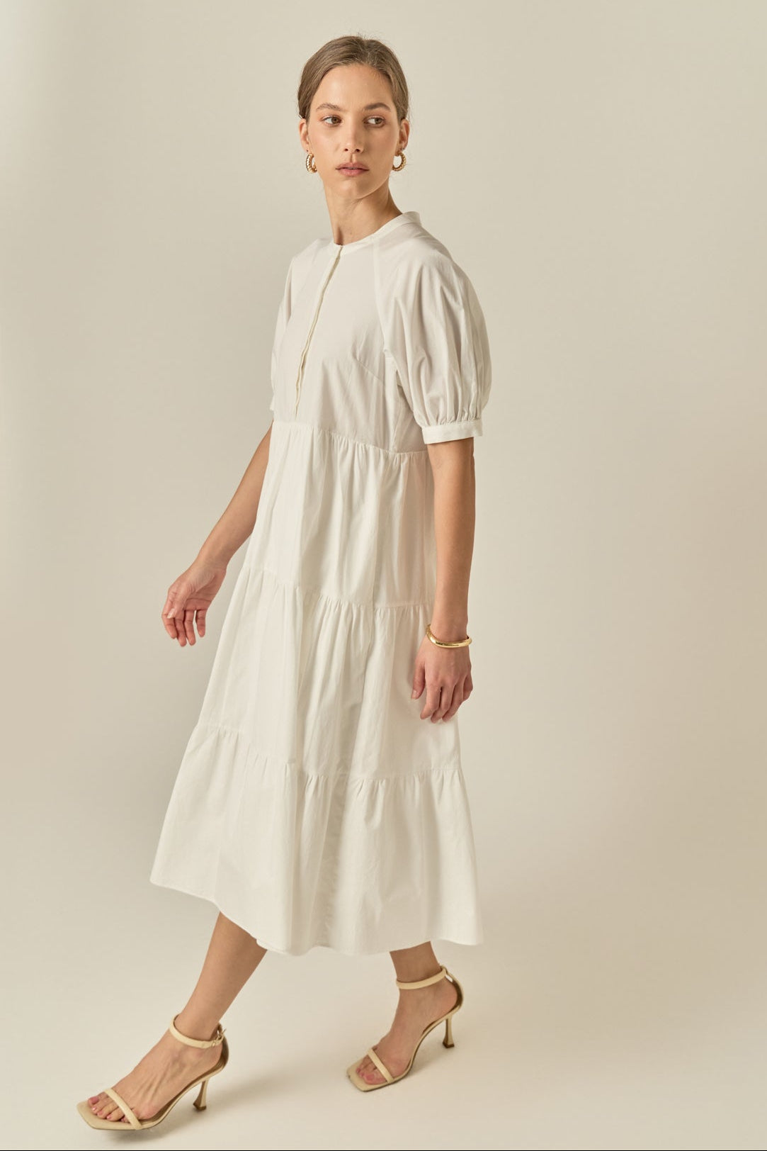 This midi dress with pockets is the perfect combination of comfort and femininity. The flowy midi dress features three tiers and puffy sleeves that create a beautiful, flattering silhouette. Plus, it has pockets (your favorite)!