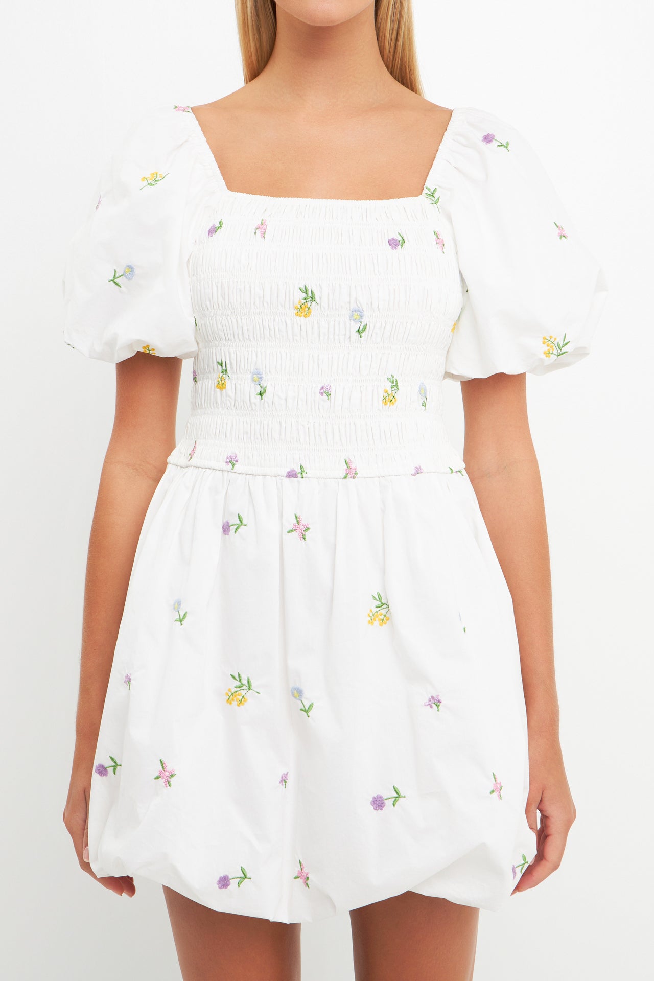 Looking for a mini that makes a statement? This smocked dress is definitely one of a kind. With beautiful floral embroidery, and a balloon style skirt, it's perfect for making any special event even more memorable. Features include short balloon sleeves and a lined bodice.