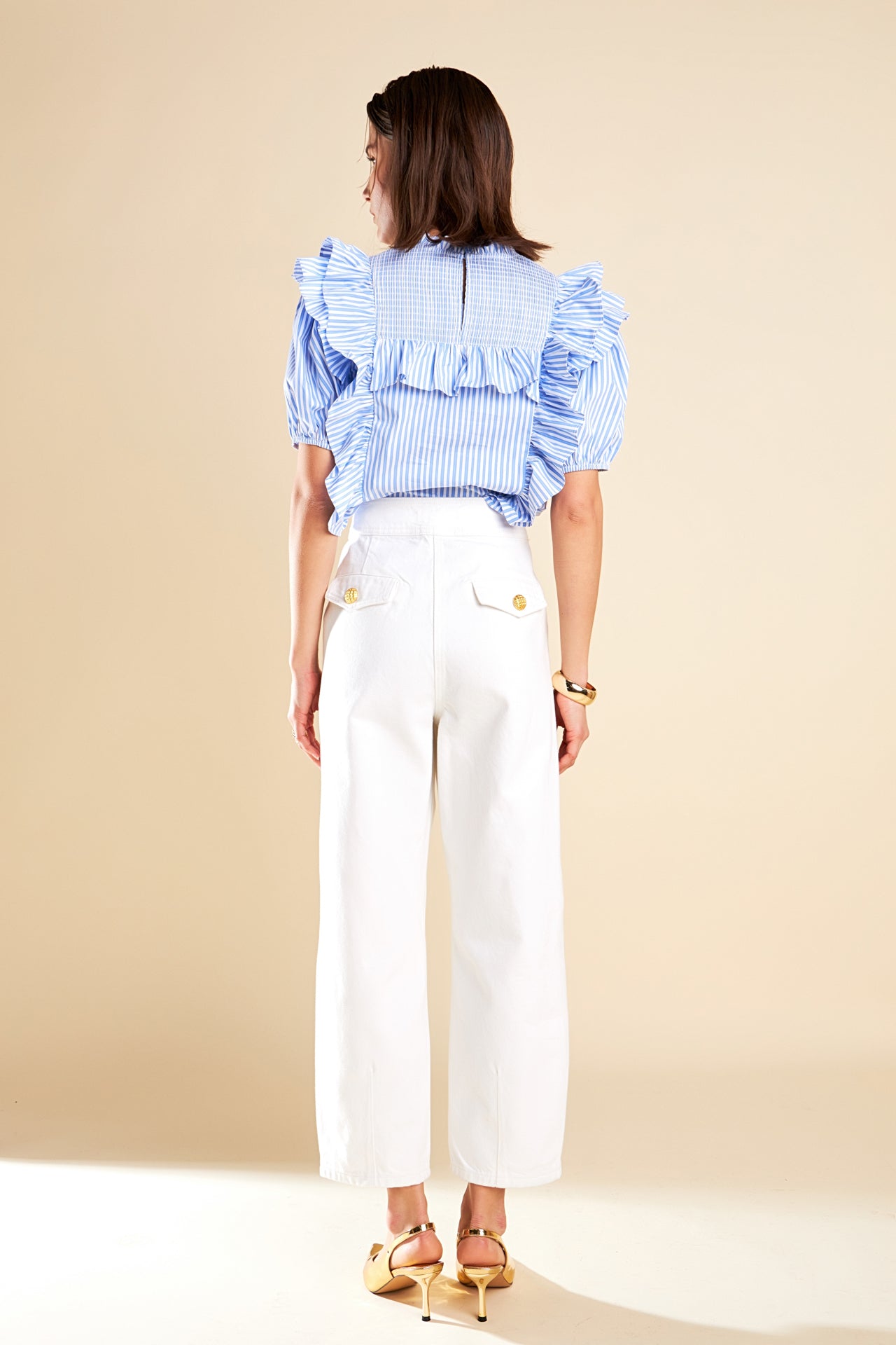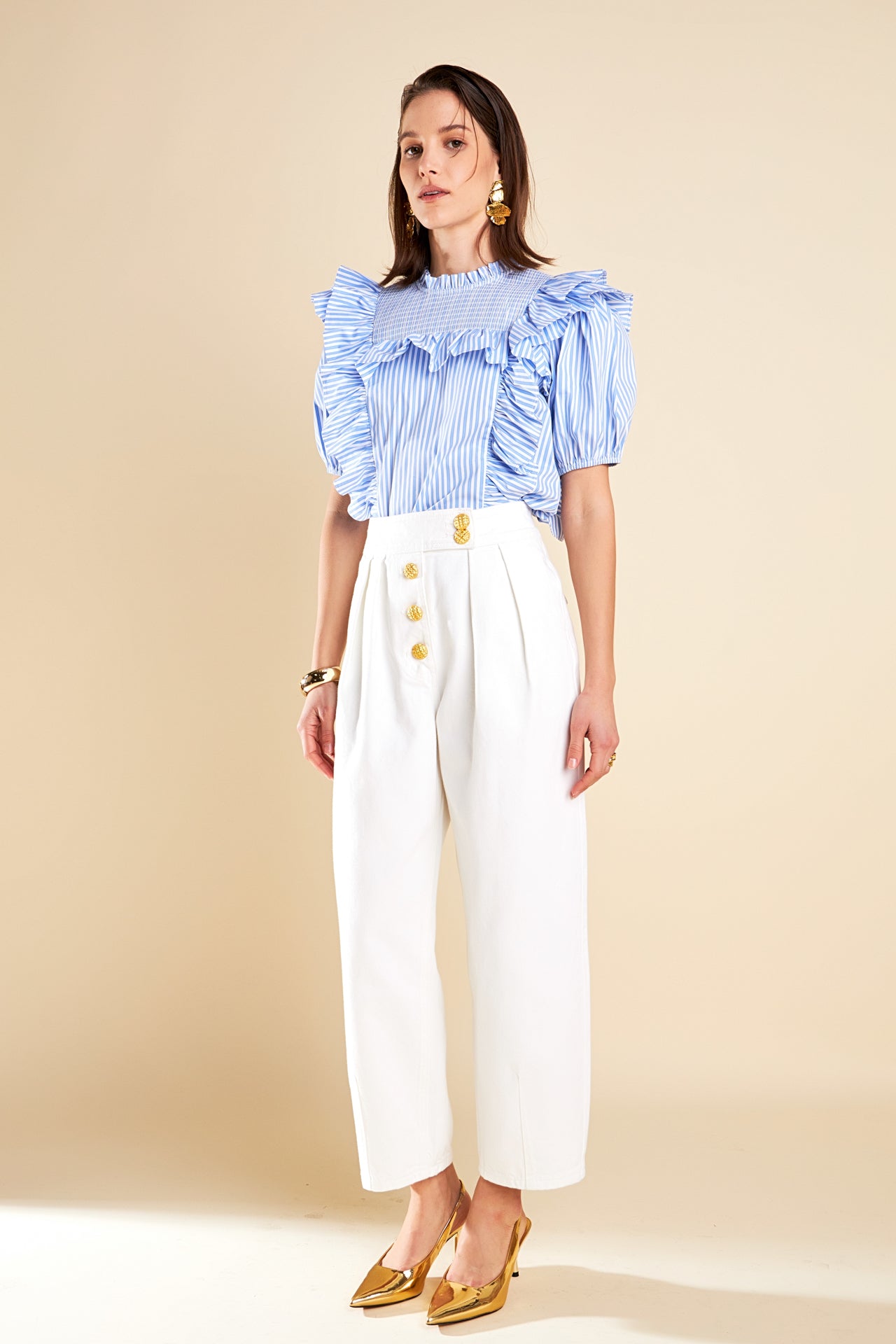 This Smocked Top is the ultimate must-have for your wardrobe! The charming round neckline with delicate ruffle detailing adds a touch of femininity to this top while the puffy short sleeves with elastic provide comfort and style. The smocked yoke gives a flattering silhouette and the ruffle details add a playful touch. Perfect for any occasion pair it with jeans for a casual look or dress it up with a skirt for a romantic vibe. Made with high-quality materials this top is not only fashionable but also durable. Get yours now and stand out with our unique and stylish Smocked Top!