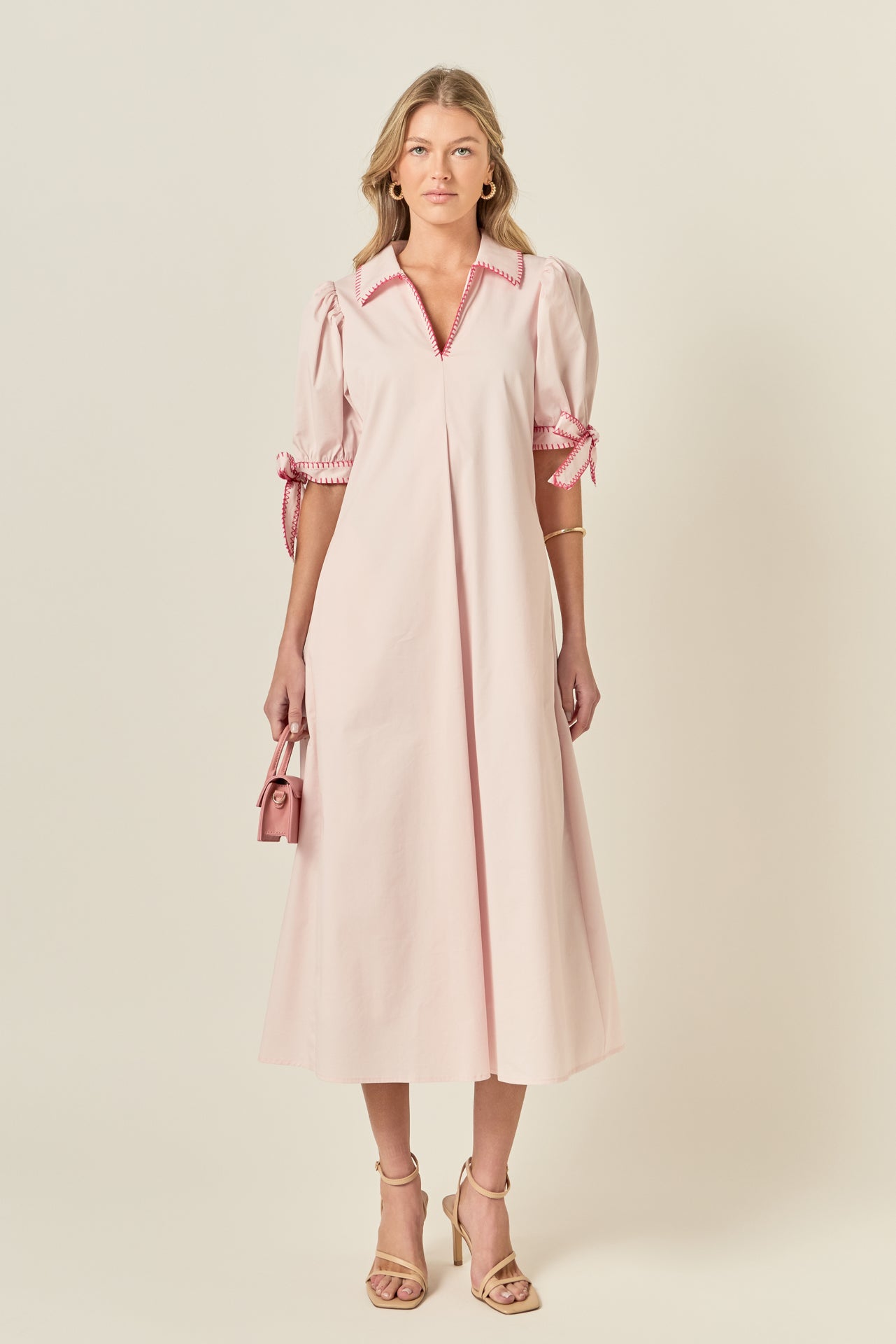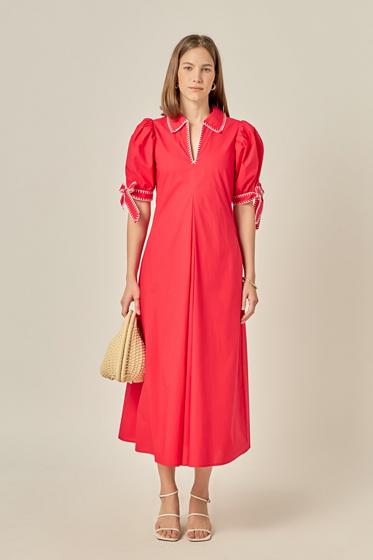 Make a statement in this Stitch Detailed Midi Dress, designed with contrast stitch detailing, a classic collar, and a flattering V-neckline. The short puff sleeves add a feminine touch, while the midi length creates a polished, effortless silhouette. Easy to wear and versatile, this dress transitions seamlessly from day to night.
