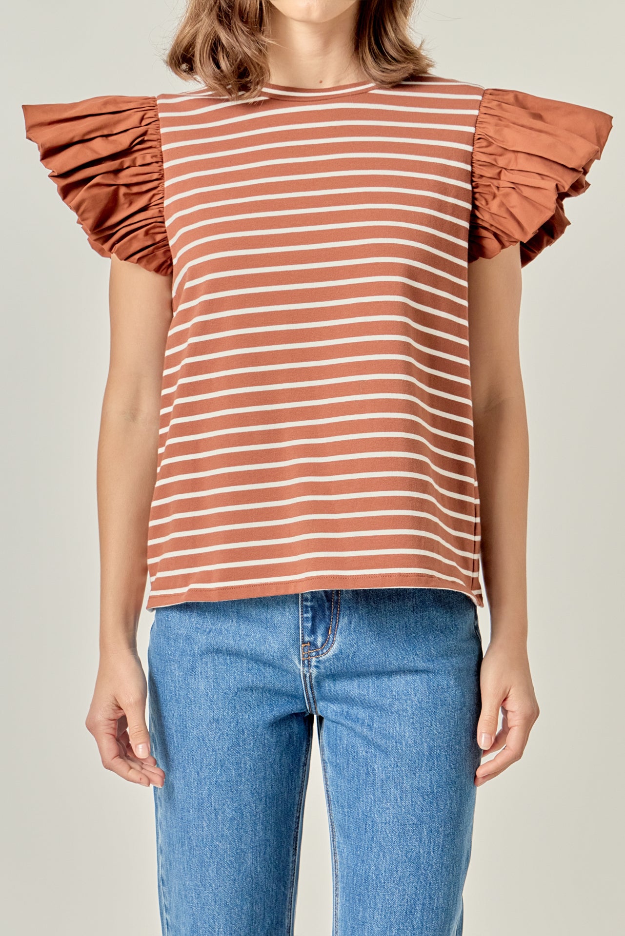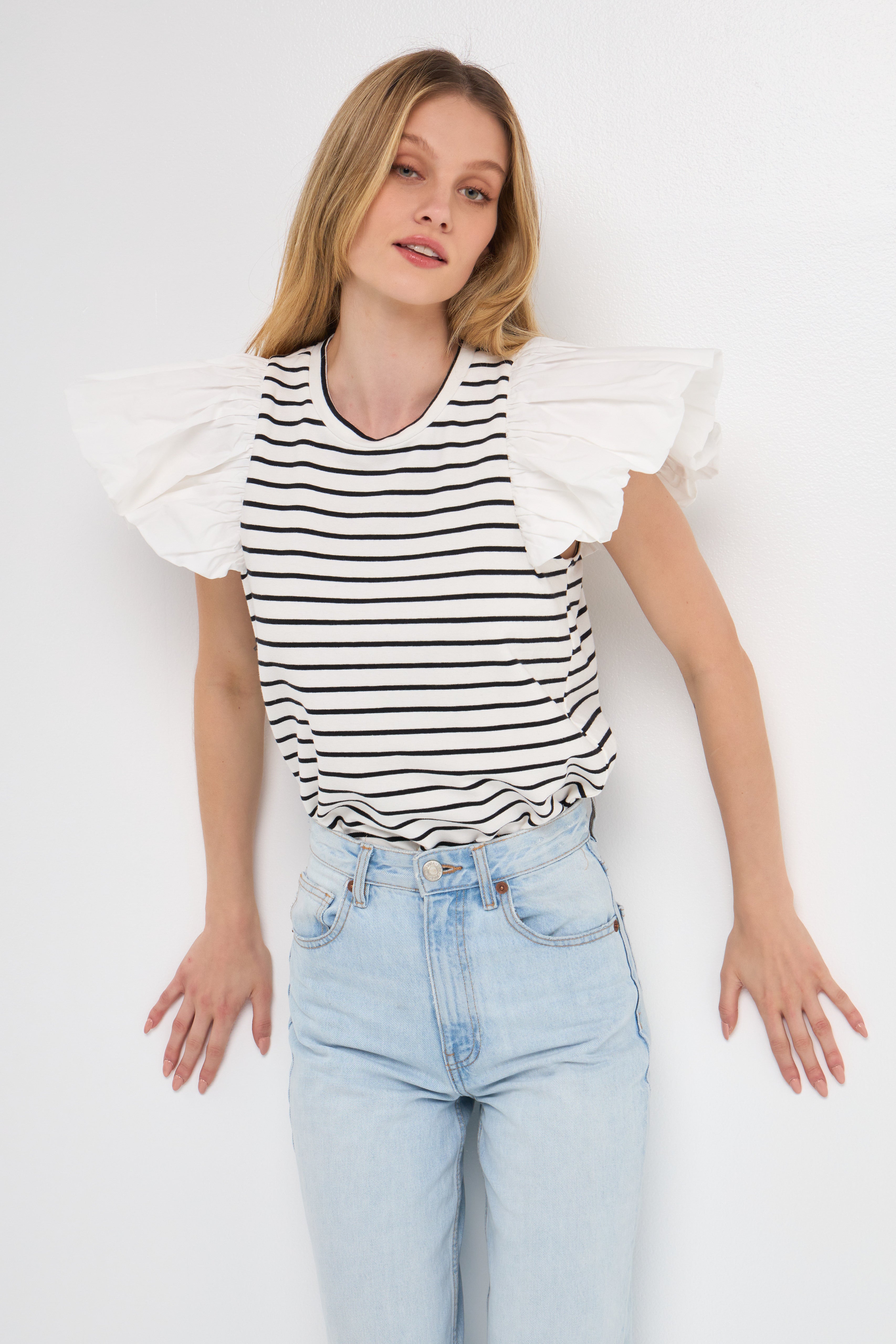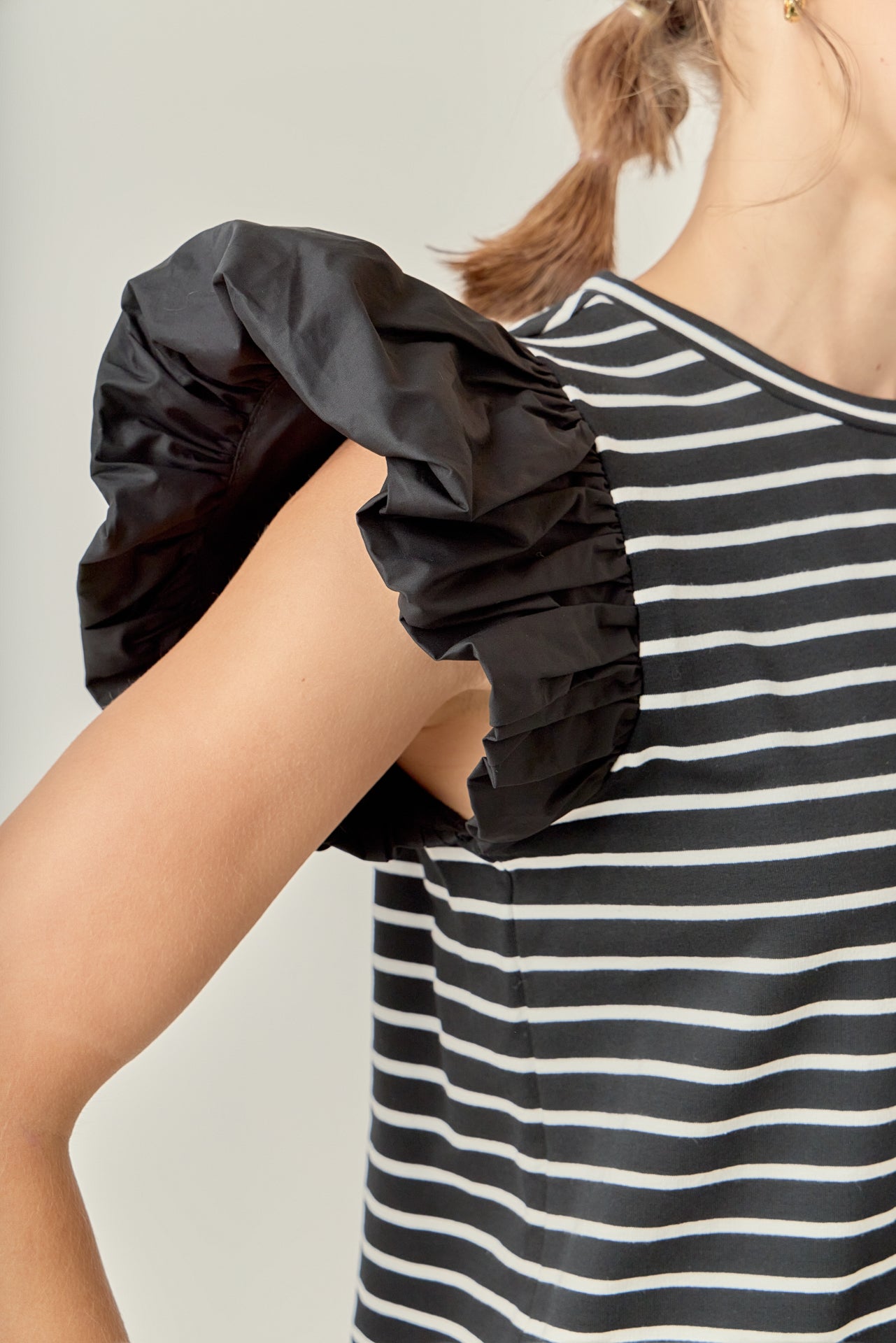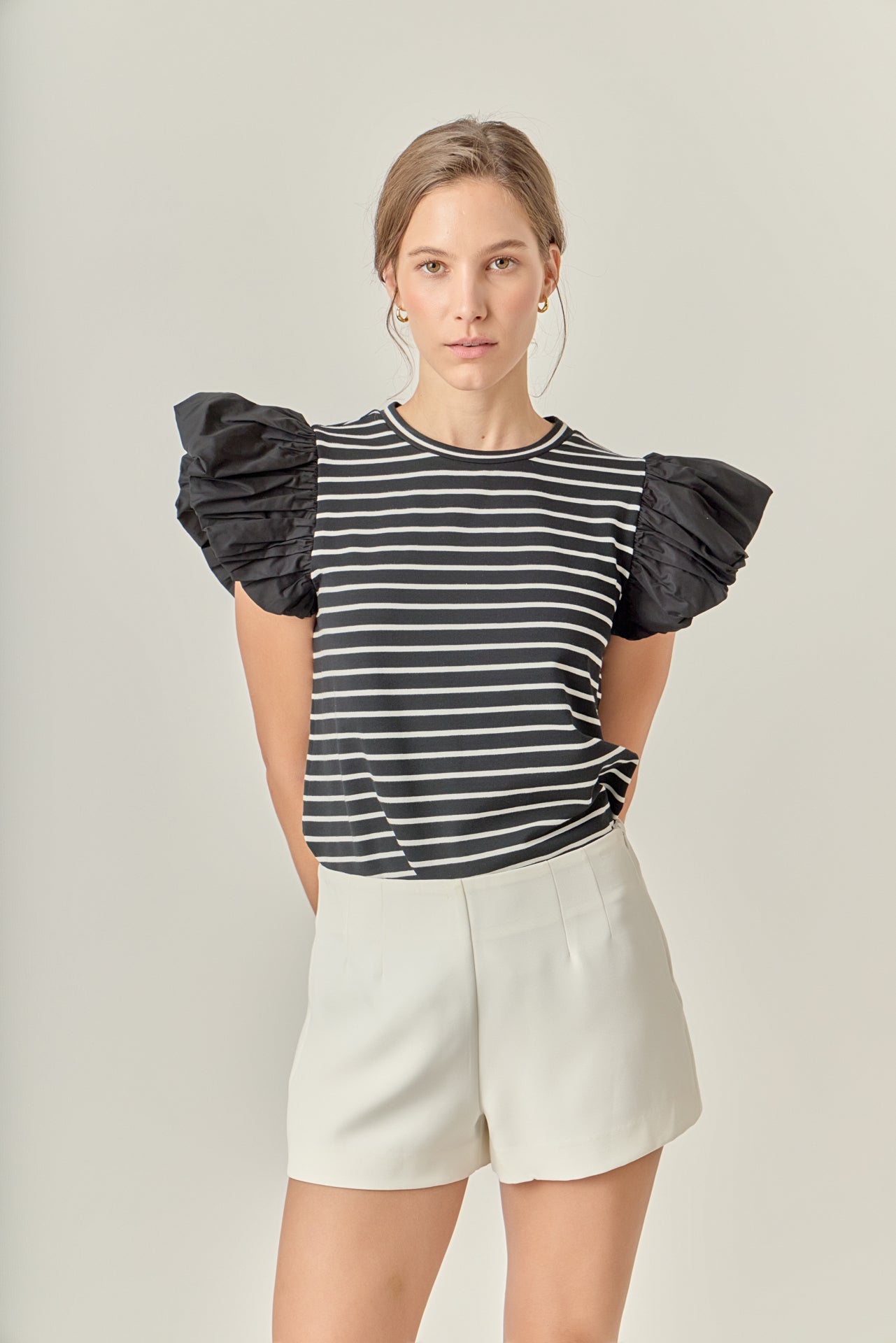 Our Stripe Knit with Poplin Puff Sleeve Top is the ideal choice for any occasion! Featuring classic stripes poplin puff sleeves and a round neckline this top is sure to make a statement. It is lightweight comfortable and made with a durable fabric for lasting wear. The combination of stripes and puff sleeves results in a look that is both fashionable and timeless. Get your classic style from our Stripe Knit with Poplin Puff Sleeve Top today, on sale now!