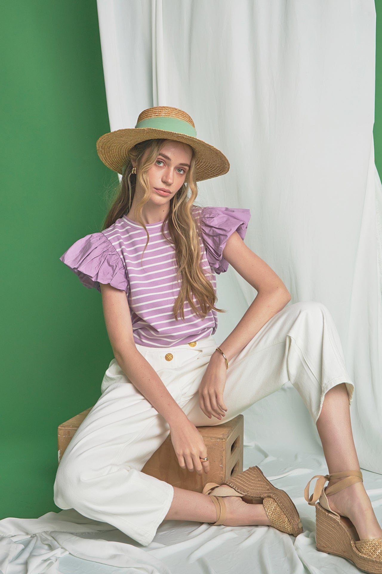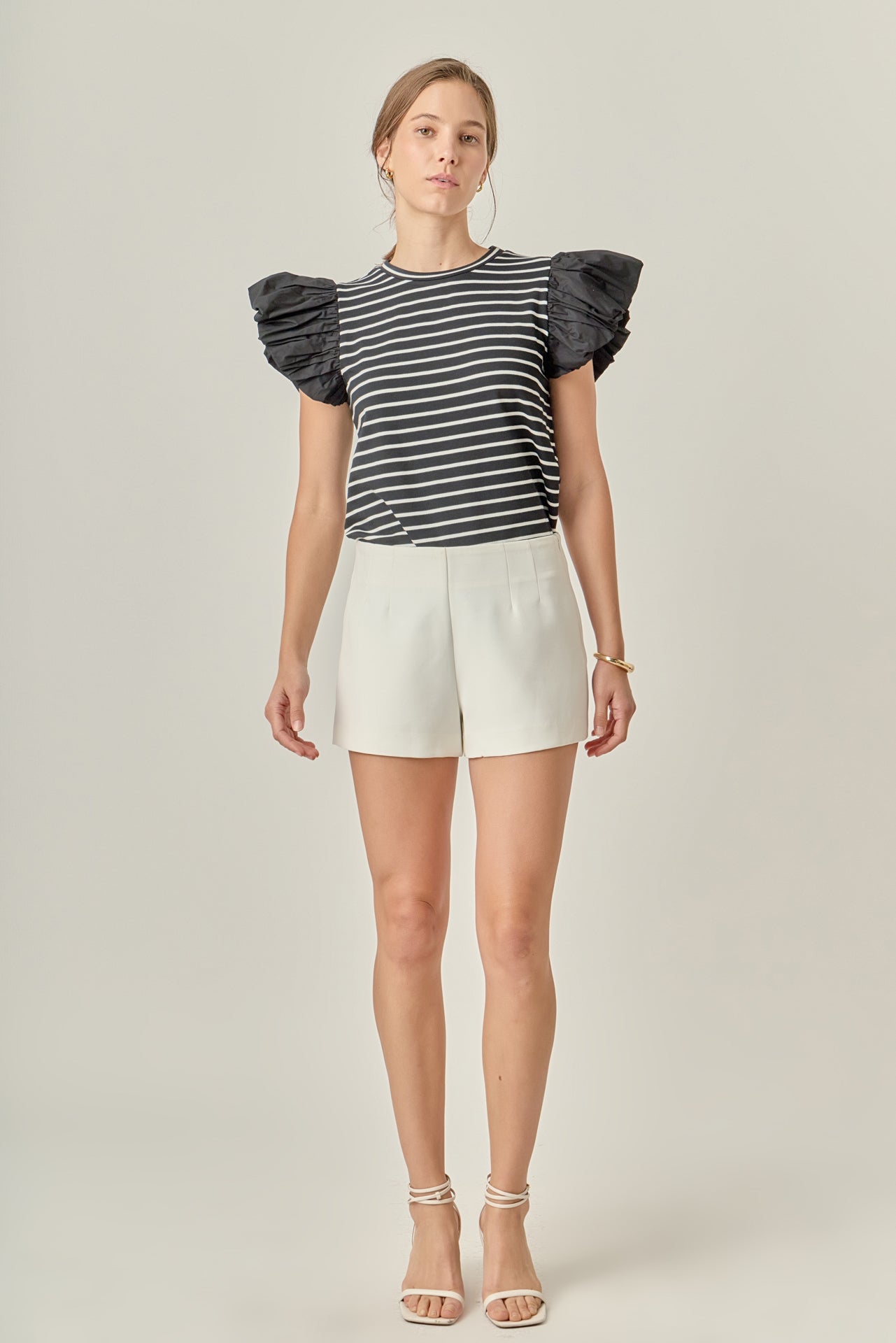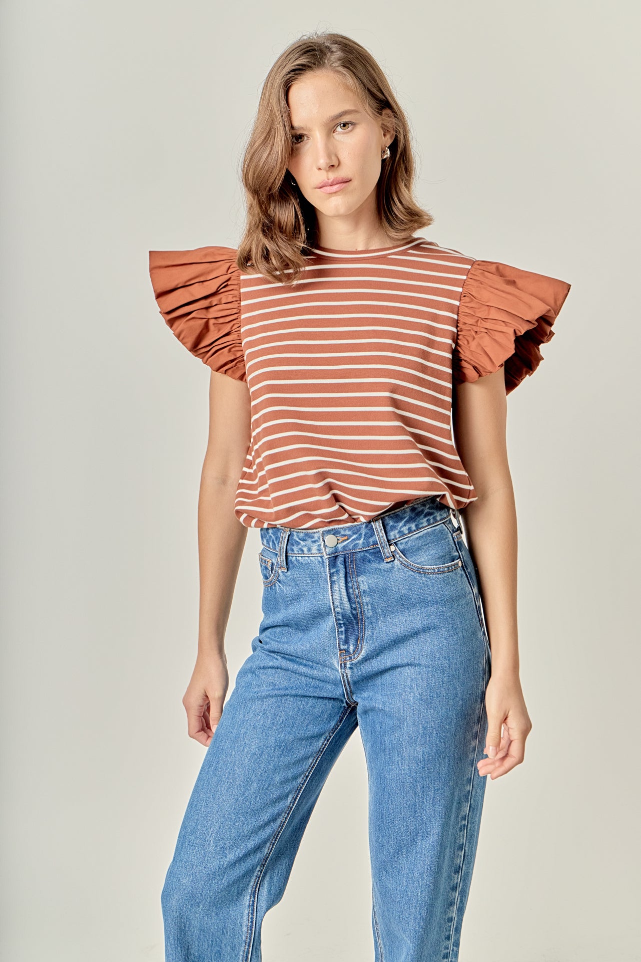 Our Stripe Knit with Poplin Puff Sleeve Top is the ideal choice for any occasion! Featuring classic stripes poplin puff sleeves and a round neckline this top is sure to make a statement. It is lightweight comfortable and made with a durable fabric for lasting wear. The combination of stripes and puff sleeves results in a look that is both fashionable and timeless. Get your classic style from our Stripe Knit with Poplin Puff Sleeve Top today, on sale now!