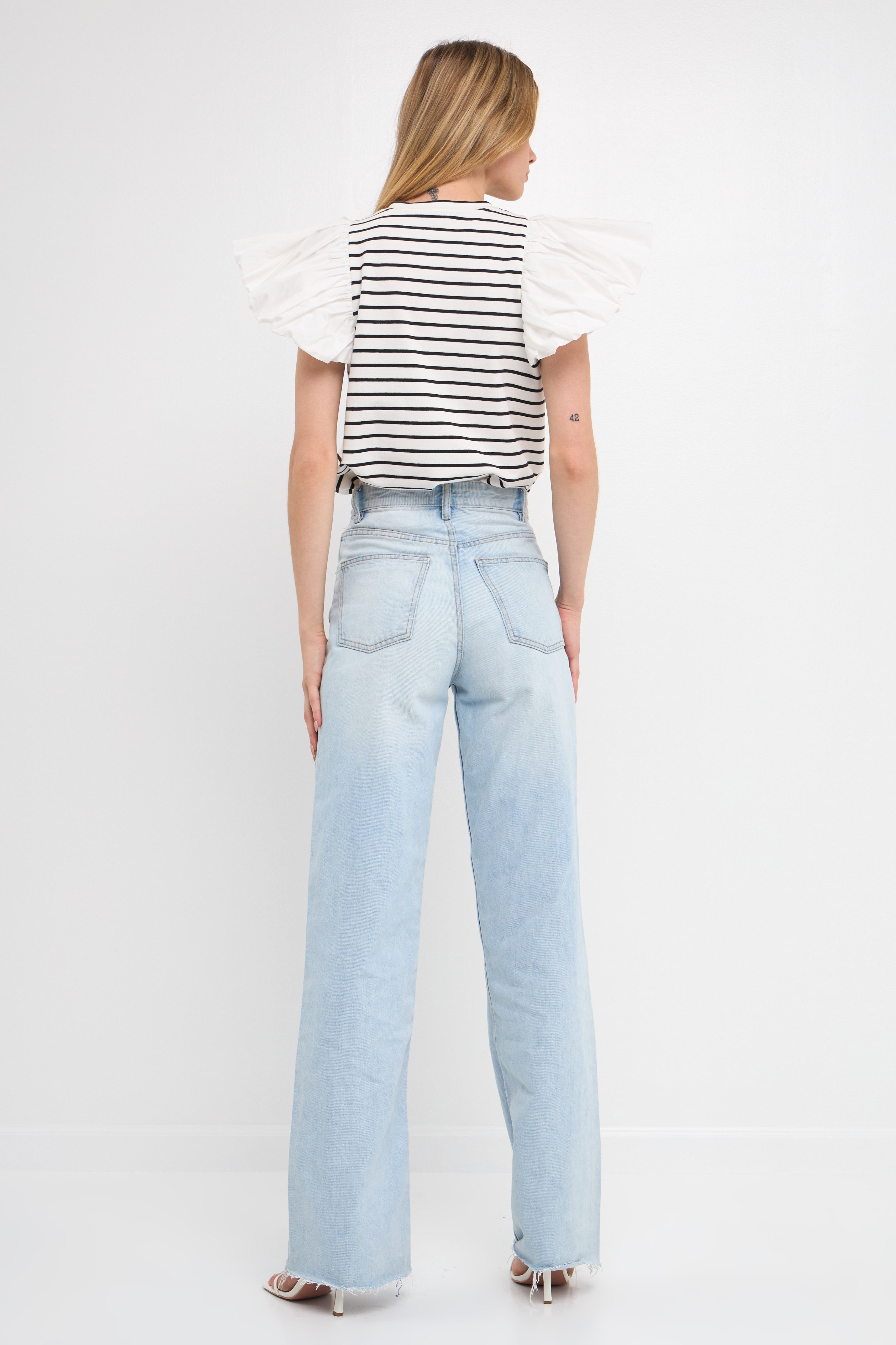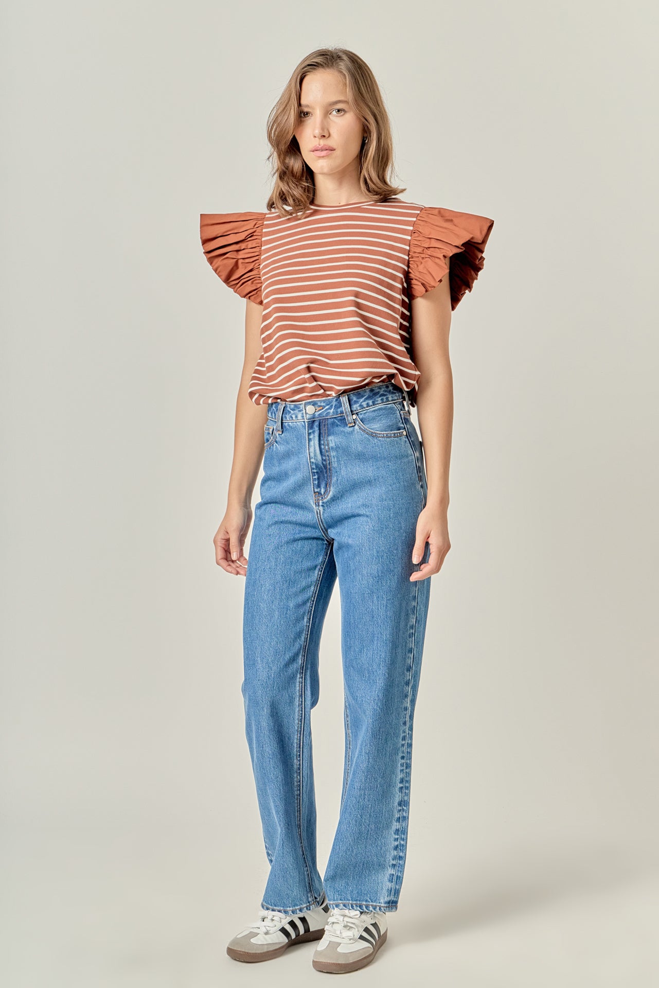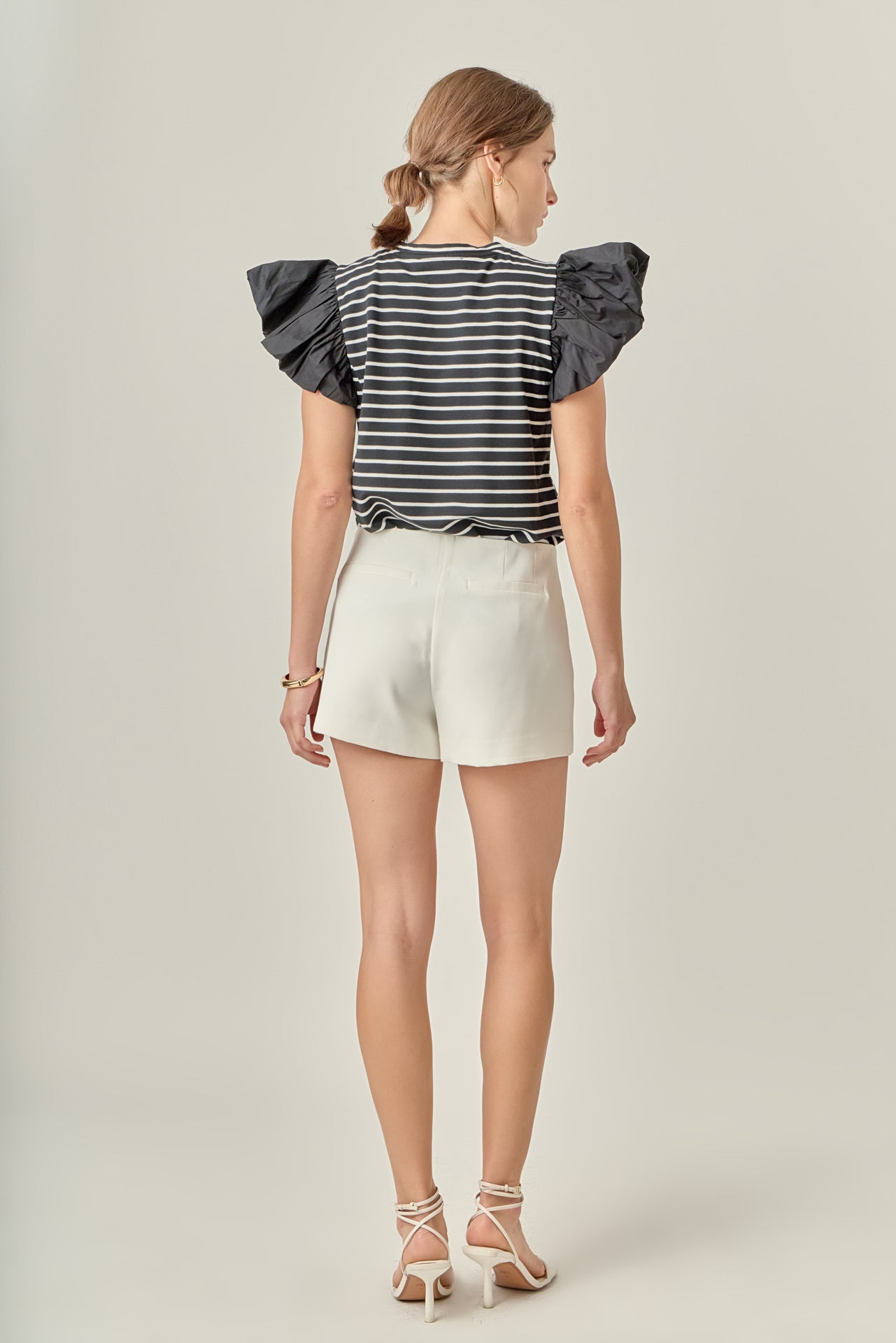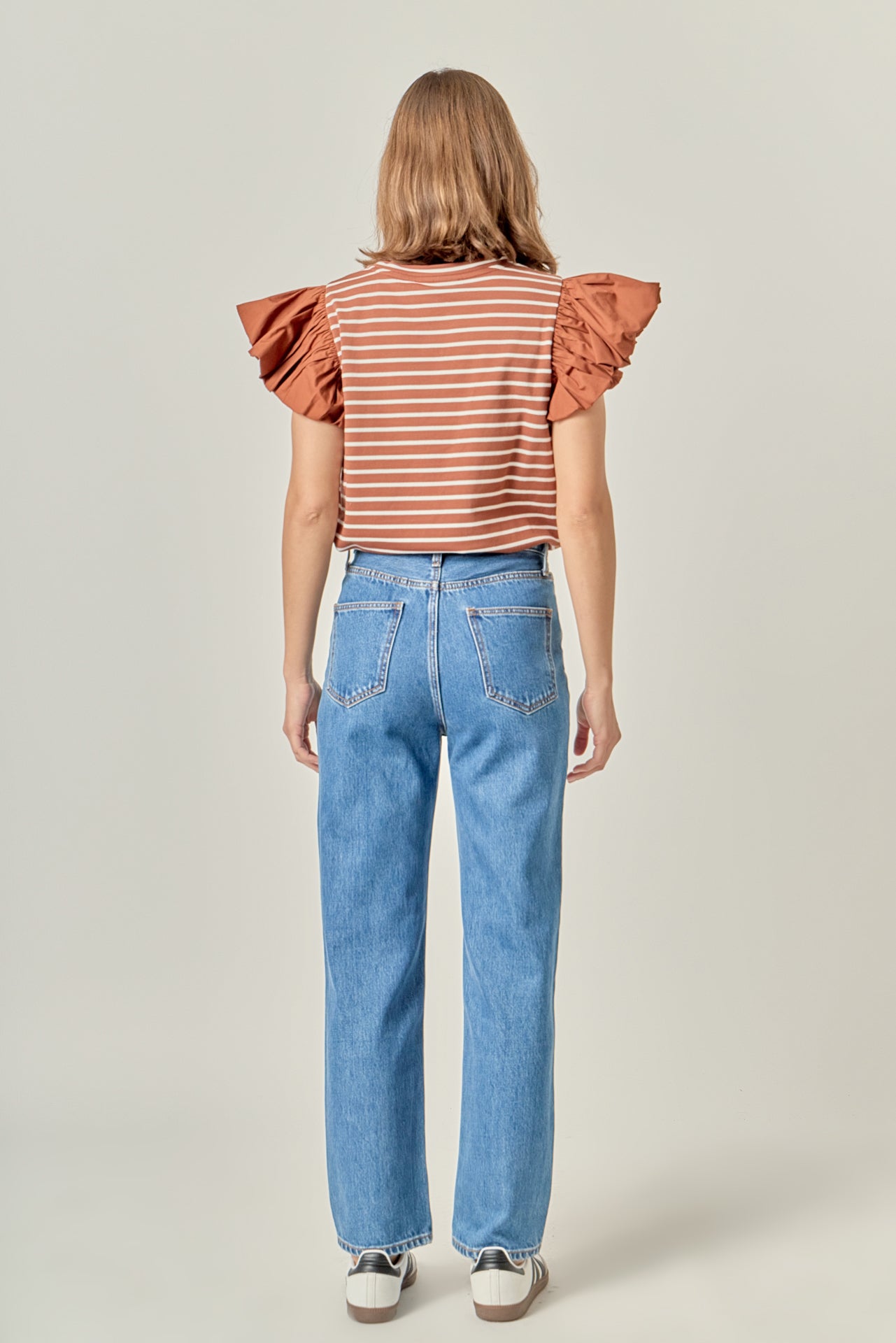 Our Stripe Knit with Poplin Puff Sleeve Top is the ideal choice for any occasion! Featuring classic stripes poplin puff sleeves and a round neckline this top is sure to make a statement. It is lightweight comfortable and made with a durable fabric for lasting wear. The combination of stripes and puff sleeves results in a look that is both fashionable and timeless. Get your classic style from our Stripe Knit with Poplin Puff Sleeve Top today, on sale now!