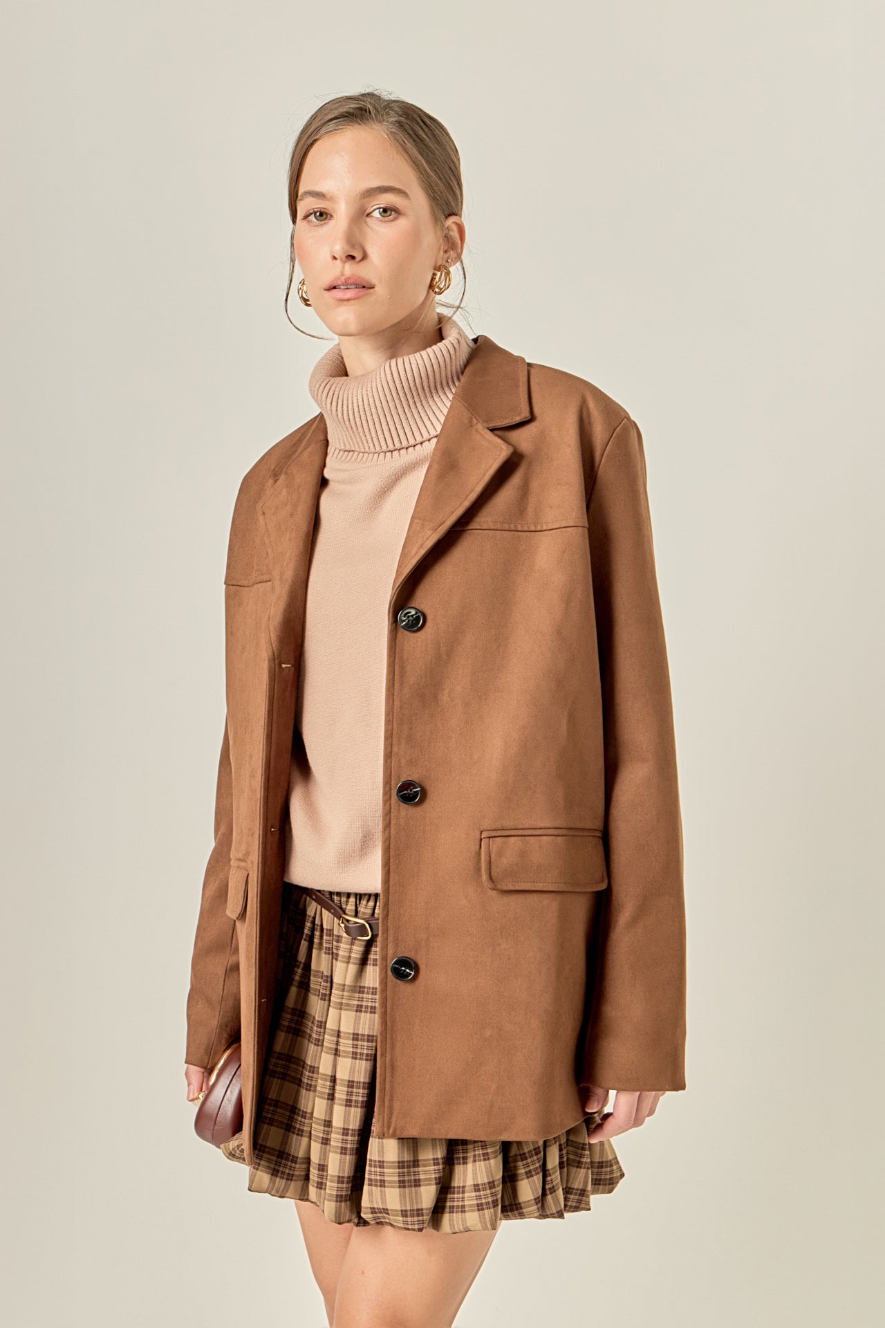 Elevate your outerwear collection with our Faux Suede Jacket, designed to bring effortless sophistication to your look. Featuring a sharp lapel collar, long sleeves, and a sleek button-front closure, this jacket combines timeless tailoring with modern ease. Crafted from soft faux suede, it delivers a luxe texture without compromising comfort. The structured silhouette makes it versatile enough to style over casual outfits or dressier ensembles, making it your go-to piece for fall and beyond.