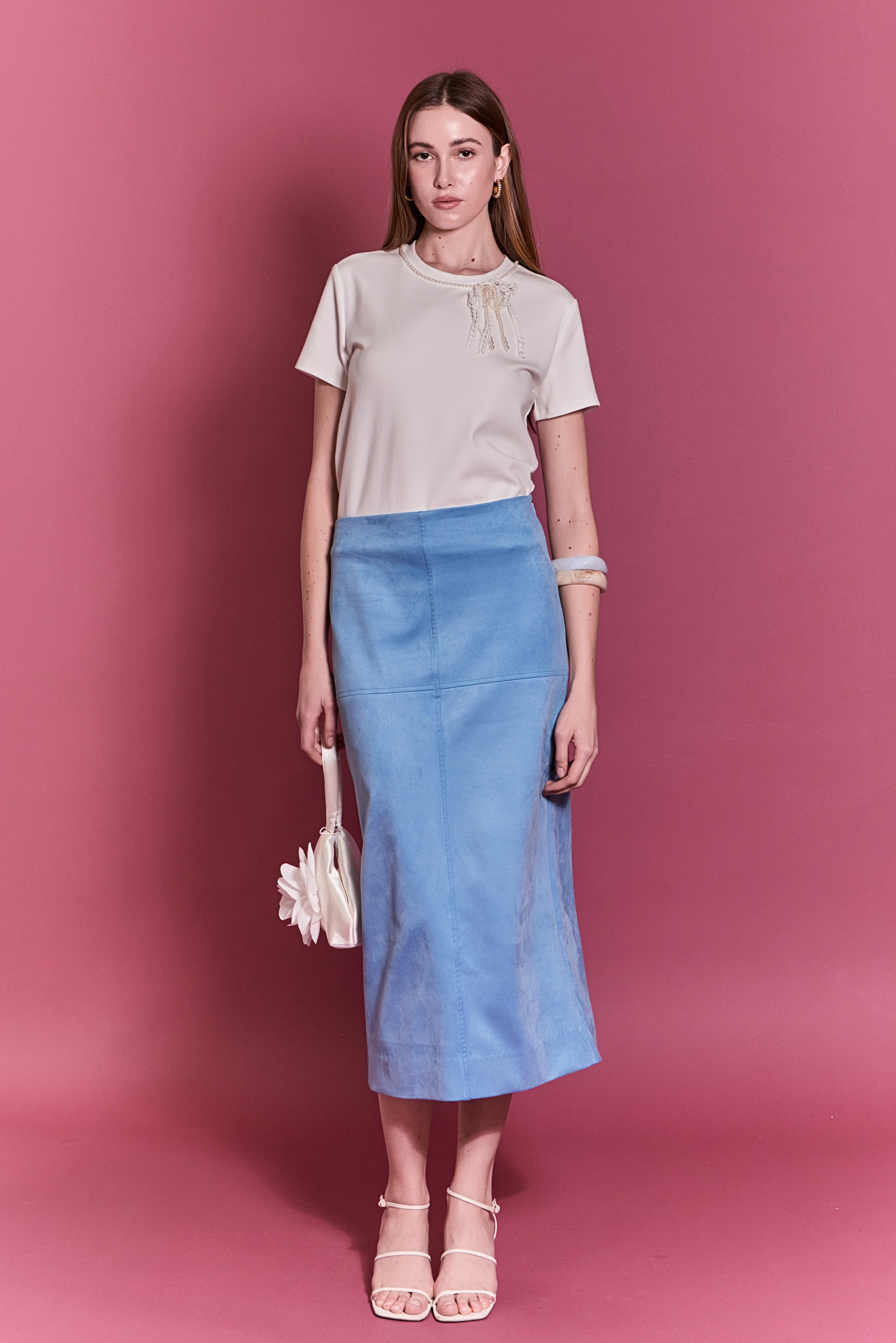 The soft suede-like texture gives this skirt refined appeal while maintaining everyday wearability, making it a fresh choice for spring days and transitional weather. Whether you’re dressing for weekend plans, brunch with friends, or relaxed workwear looks, this skirt brings polished structure to every look.