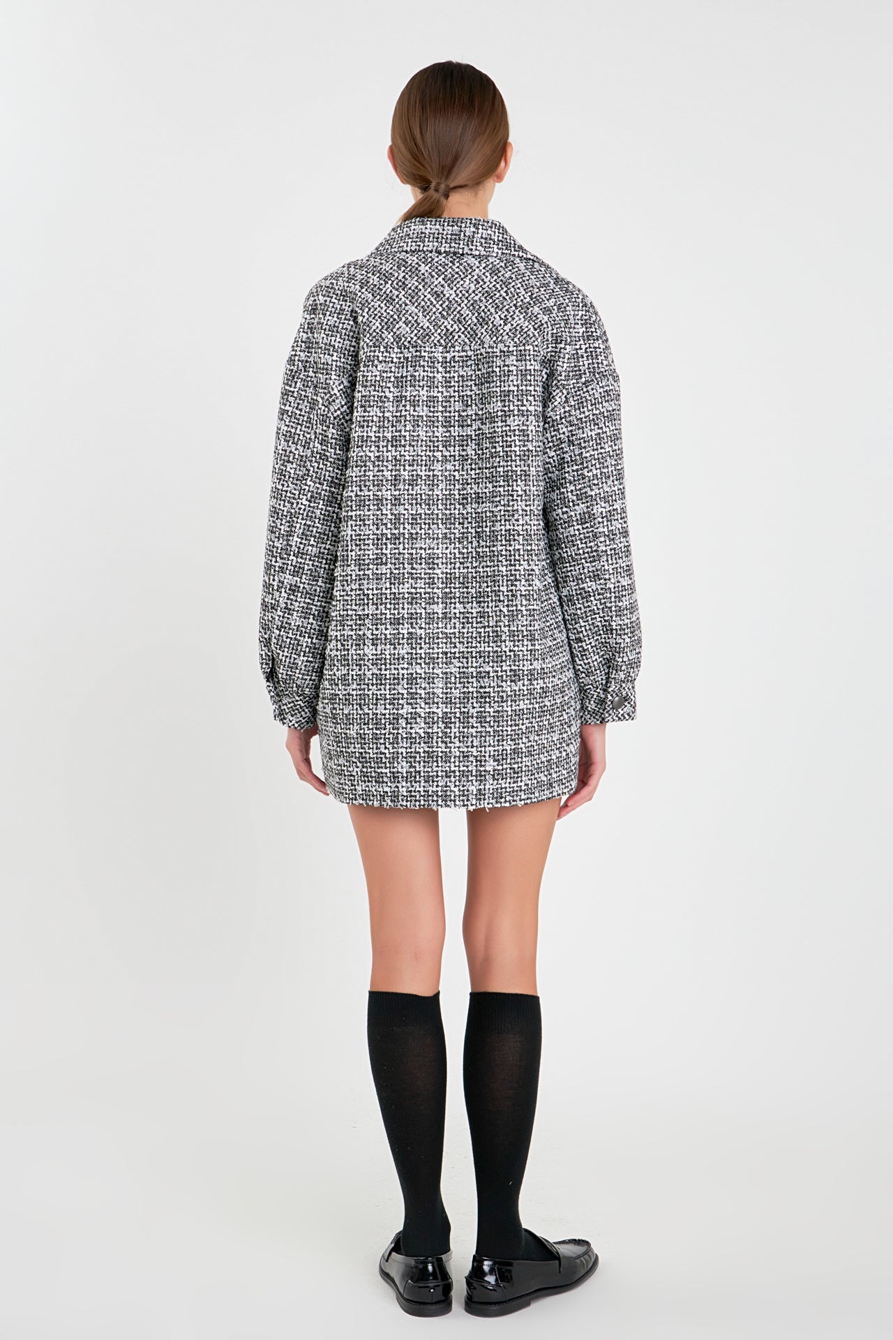 This classic Tweed Shirt Jacket is perfect for a stylish look. Made with a collared neckline long sleeves and front button down closure it can be worn on almost every occasion. It is tailored from high-quality tweed fabric that ensures durability and is sure to be your go-to for a timeless look. Highlighted by unique details this jacket elevates any outfit without compromising on comfort.