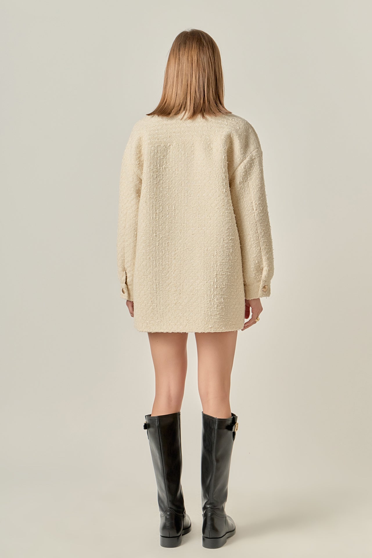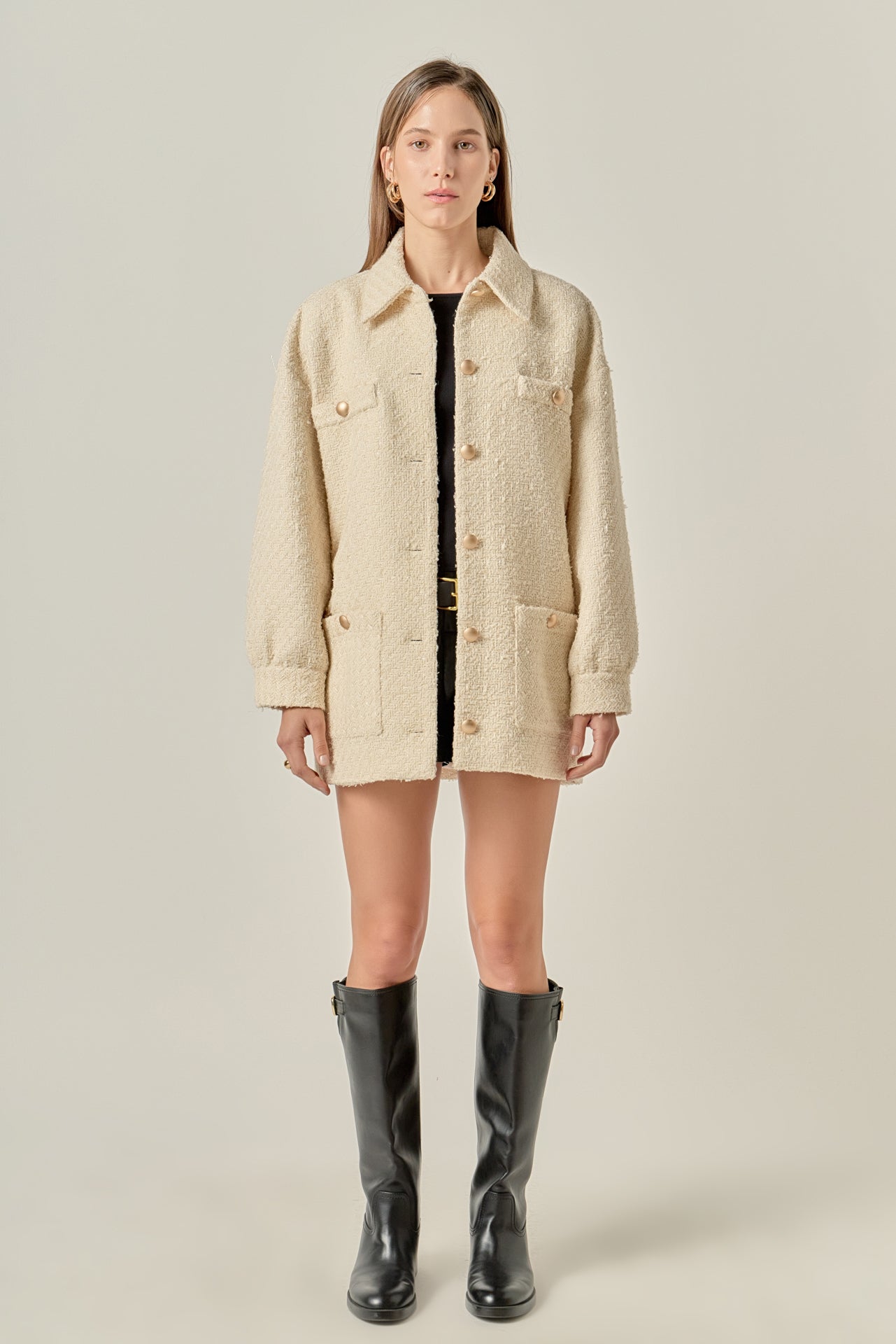 This classic Tweed Shirt Jacket is perfect for a stylish look. Made with a collared neckline long sleeves and front button down closure it can be worn on almost every occasion. It is tailored from high-quality tweed fabric that ensures durability and is sure to be your go-to for a timeless look. Highlighted by unique details this jacket elevates any outfit without compromising on comfort.