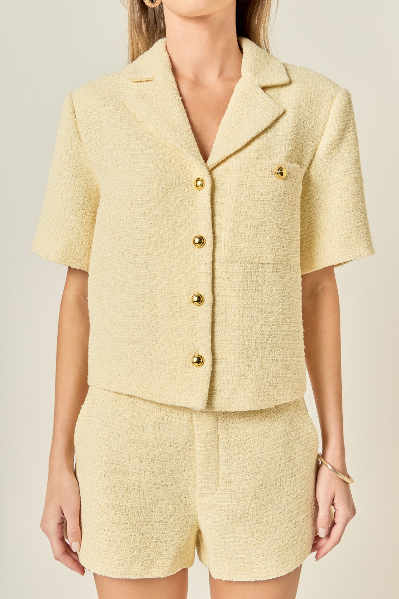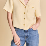 Effortless elegance meets everyday wear. Our Tweed Short Sleeve Shirt brings a timeless touch to your wardrobe with its structured silhouette and refined details. Featuring a tailored collar, short sleeves, and a sleek button-down front with luxe gold buttons, this piece blends classic charm with modern polish. A chest pocket with matching gold hardware adds a stylish, functional finish. Pair it with trousers for a professional look or dress it down with denim for weekend chic - either way, this versatile staple will elevate any outfit.
