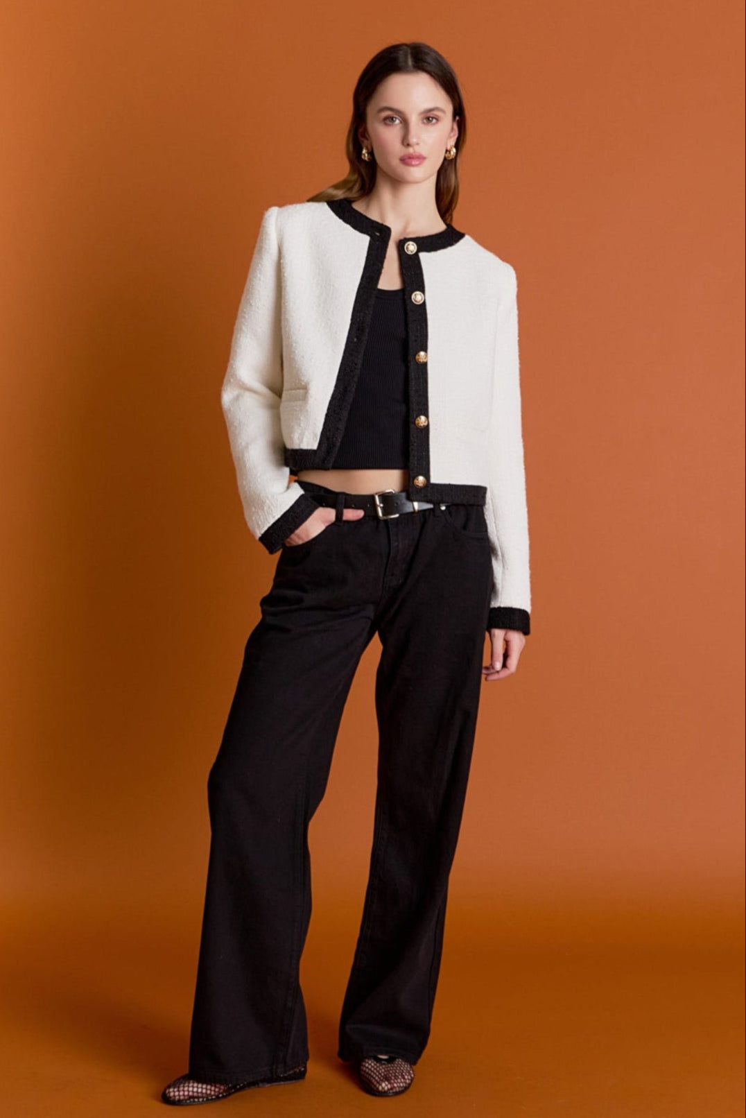 Upgrade your jacket game with our stylish White & Black Collarless Tweed Jacket. This jacket features shoulder pads for a sophisticated silhouette a round neckline for a modern touch and a contrast trim for a pop of color. The front welt pockets with gold buttons add a touch of elegance. Made with high-quality materials this jacket is both comfortable and chic. Perfect for any occasion pair it with pants skirts or dresses for a polished look. Elevate your wardrobe with this must-have piece.